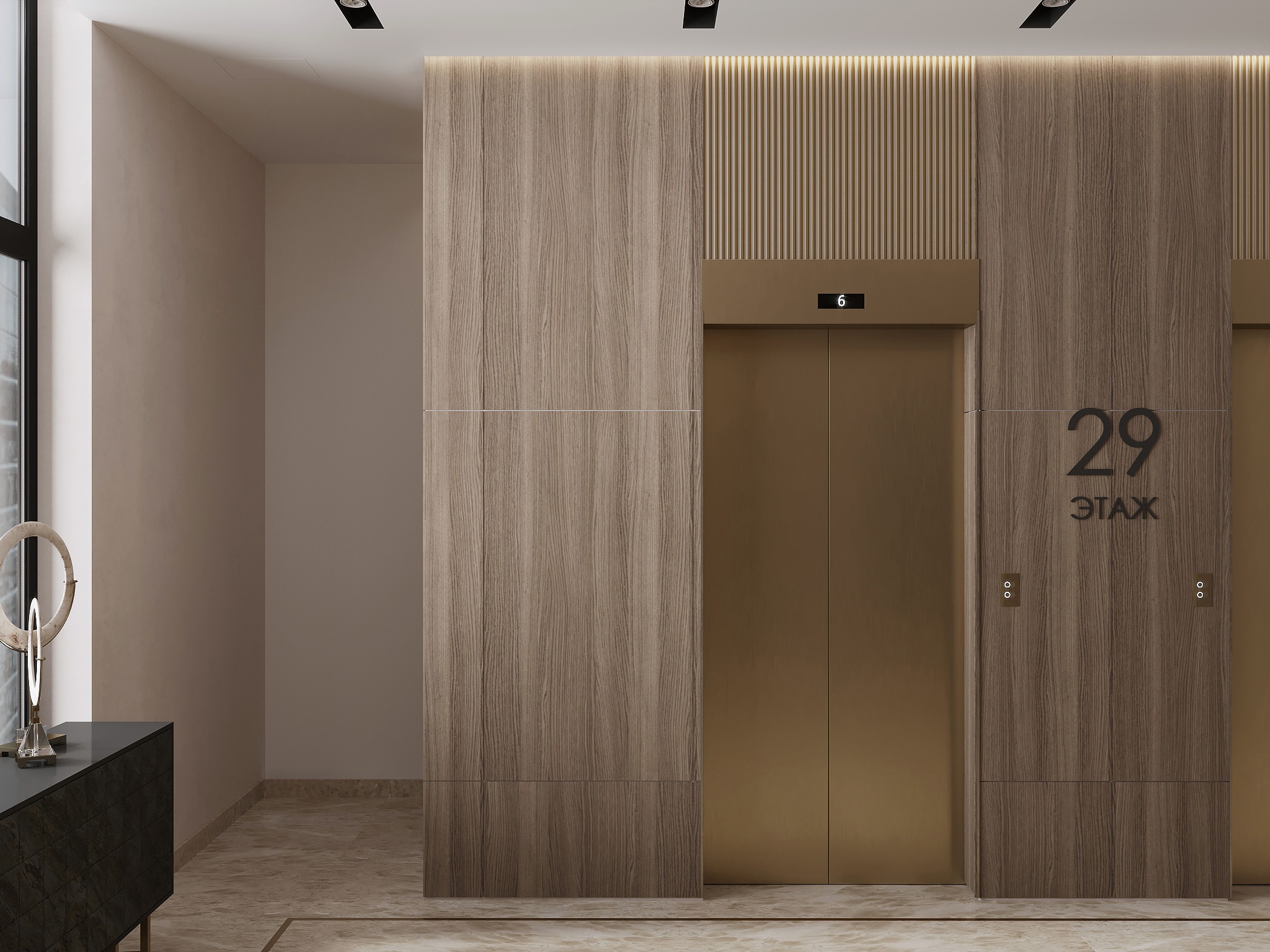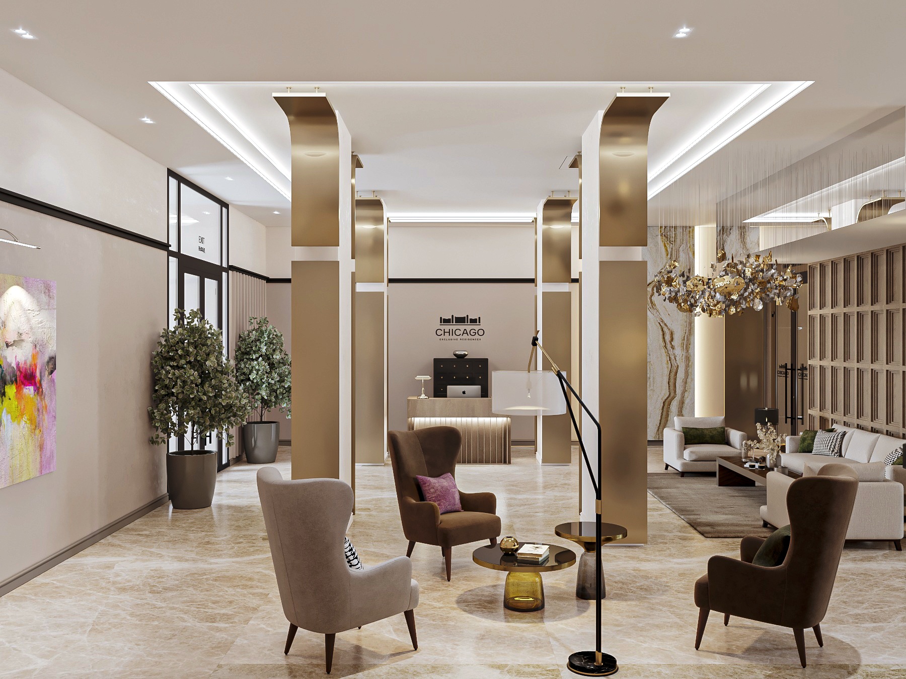 Дизайн лобби, лифтовых и этажных холлов соответствует актуальным тенденциям: акцент на качестве, использовании природных материалов и ручной работы. Девелопер принял во внимание искушенность потенциального жильца CHICAGO, который привык к дорогим отелям, отдыху на просторных виллах и знает, как выглядит роскошь. Интерьер общественных зон дополняют авторская мебель и произведения современного искусства.
