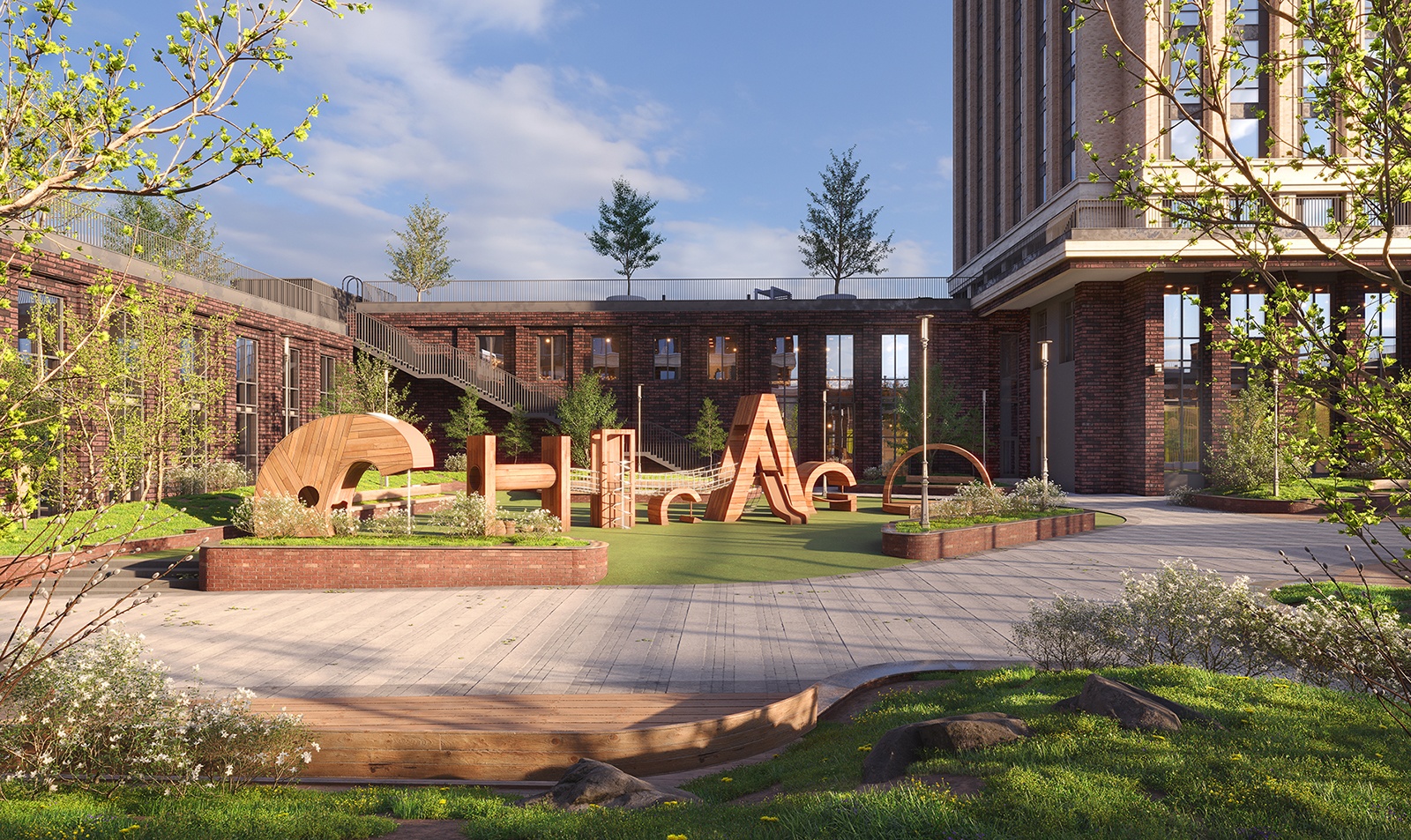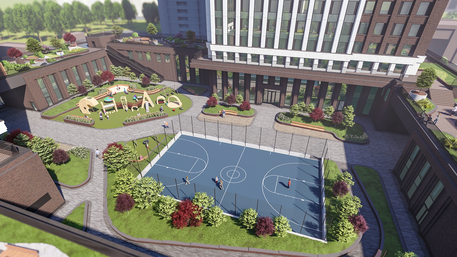 Ландшафт придомовой территории поистине изумляет своим размахом. На первом уровне — зона активных игр, велодорожки и детские площадки. Второй уровень — терраса, предназначенная для созерцательного отдыха, спокойного общения и занятий спортом. На каждом уровне установлена специально разработанная уличная мебель и высажены сезонные растения и кустарники.