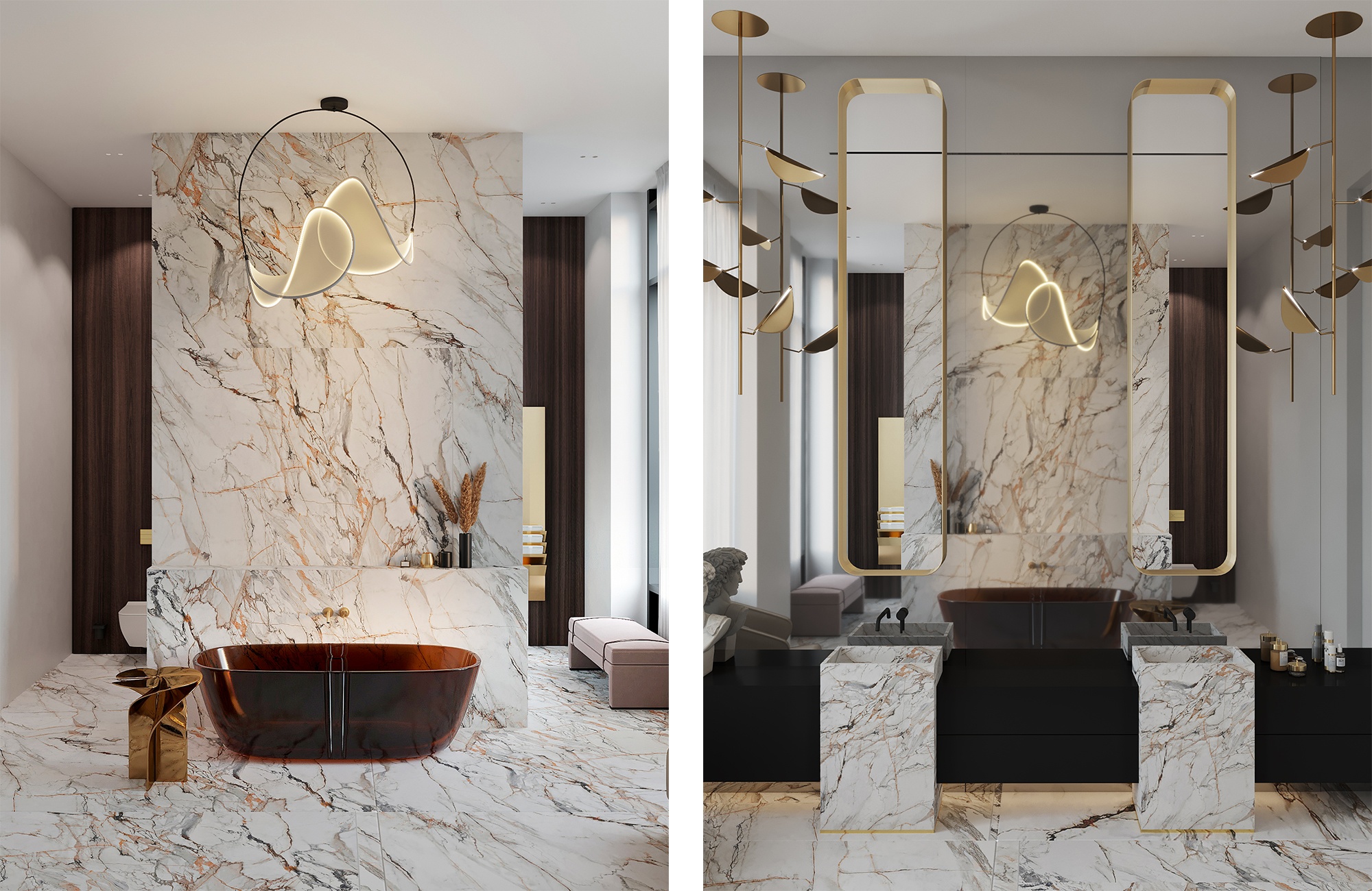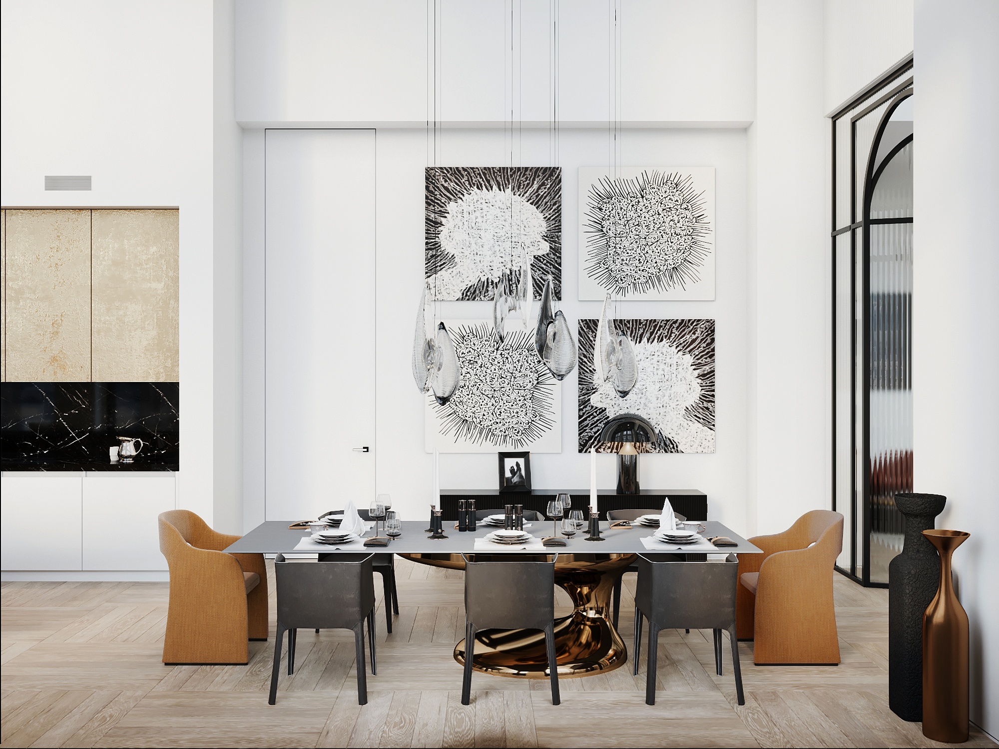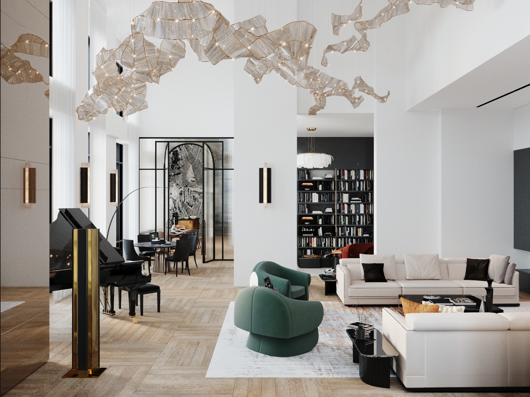 Свободная планировка огромного пространства пентхаусов позволяет владельцу конструировать жилое пространство в соответствии с собственными вкусовыми предпочтениями. В пентхаус можно интегрировать кухню, столовую, гостиную, библиотеку и кабинет, а также камерный концертный зал. Для демонстрации потенциала этих грандиозных объектов дизайнеры застройщика визуализировали интерьер, который мог бы здесь появиться.