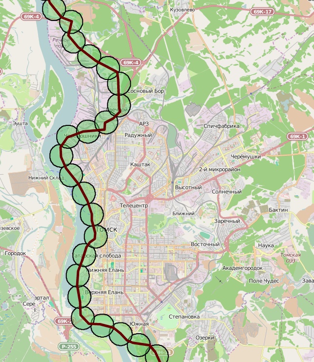 а) этот трамвайный маршрут проходит на отдалении не только от жилых массивов, но и от делового центра города. Круги — это 500-метровые радиусы пешеходной доступности. Сколько людей живет в их пределах? Не думаем, что больше 10 тысяч. Для поездок по городу этот маршрут будет неудобен чуть менее, чем полностью.