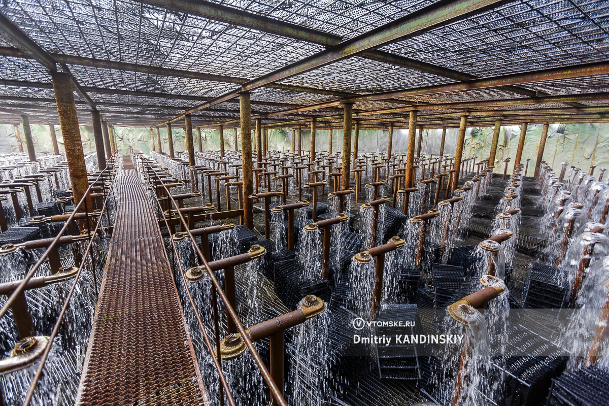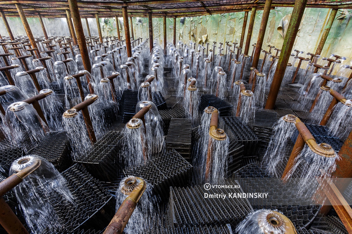 Над «фонтанчиками» закреплены каплеуловители. Они смонтированы в градирни для удаления конденсированных капель из воздуха: часть конденсата остается на деталях уловителей, после чего капли падают вниз. Это позволяет сократить потерю пара.