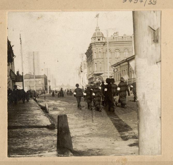 Городская полиция с улиц совершенно исчезла. Порядок нигде не был нарушен. Обыватель стал гражданином. Комендант города распорядился сформировать «военную полицию» из нижних чинов, в числе до 200 человек. Один из этой полиции с красной перевязью на левом рукаве, другие с винтовками за плечом ходили по улицам, стояли на перекрестках, очевидно, на всякий случай, но эта предосторожность оказалась излишней» («СЖ». 1917. № 49 от 3 марта).