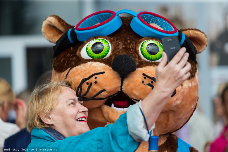 Август. Томичи фотографируются с талисманом первенства мира по плаванию в ластах. Фото: Дмитрий Кандинский / vtomske.ru