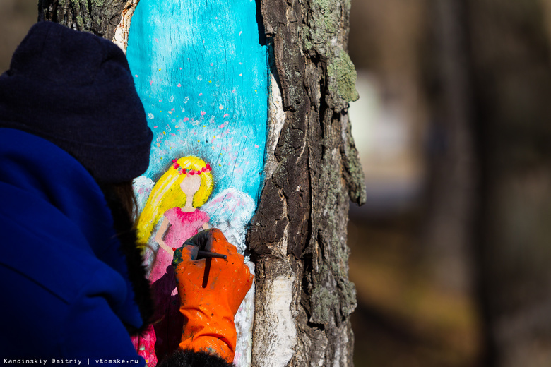 Октябрь. Томичка рисует картины на деревьях. Фото: Дмитрий Кандинский / vtomske.ru