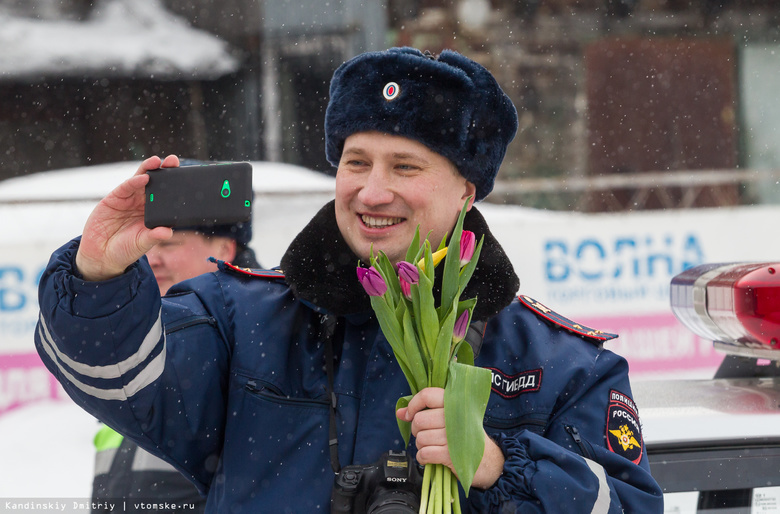 Март. Сотрудник ГИБДД готовится подарить цветы автоледи на 8 марта. Фото: Дмитрий Кандинский / vtomske.ru