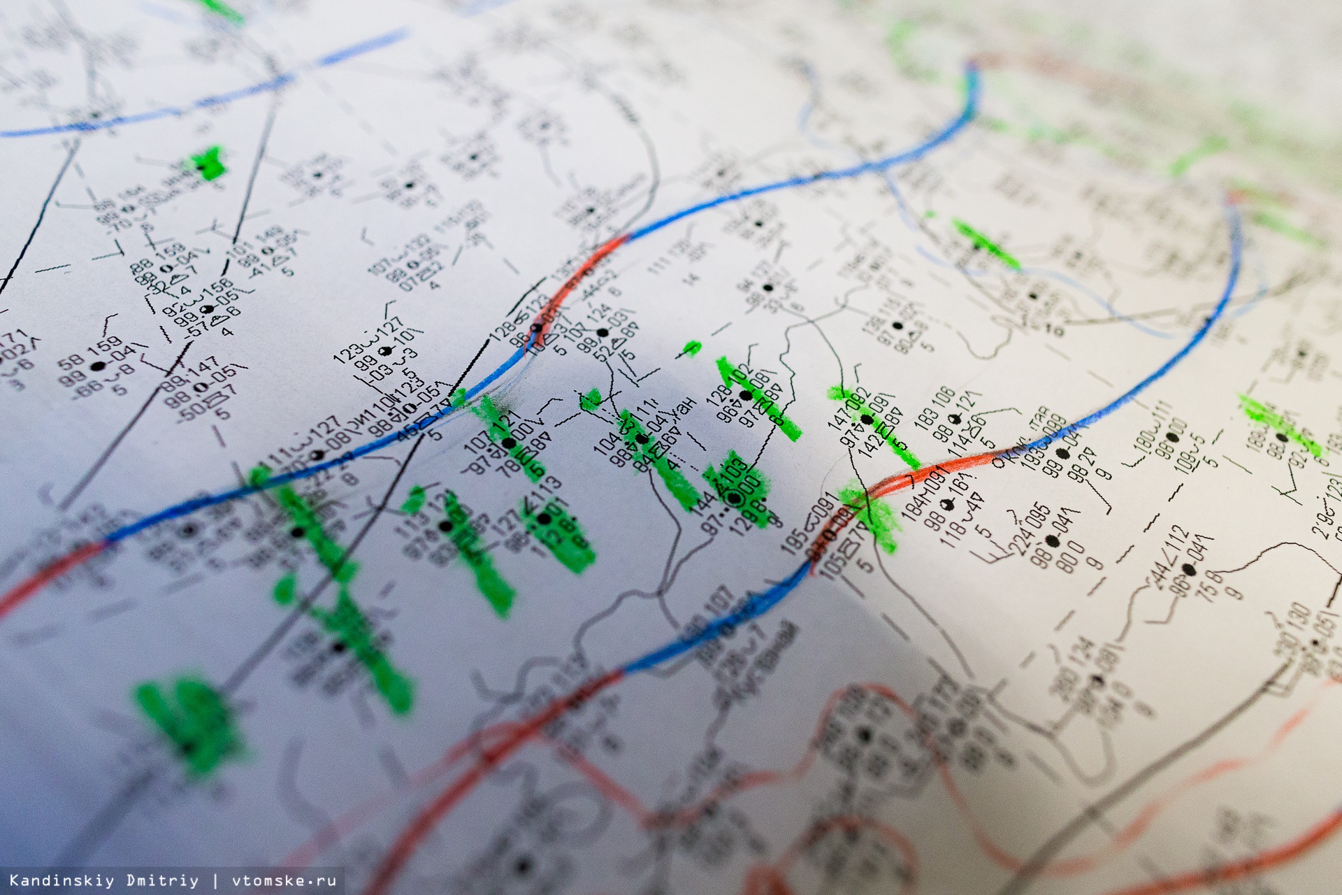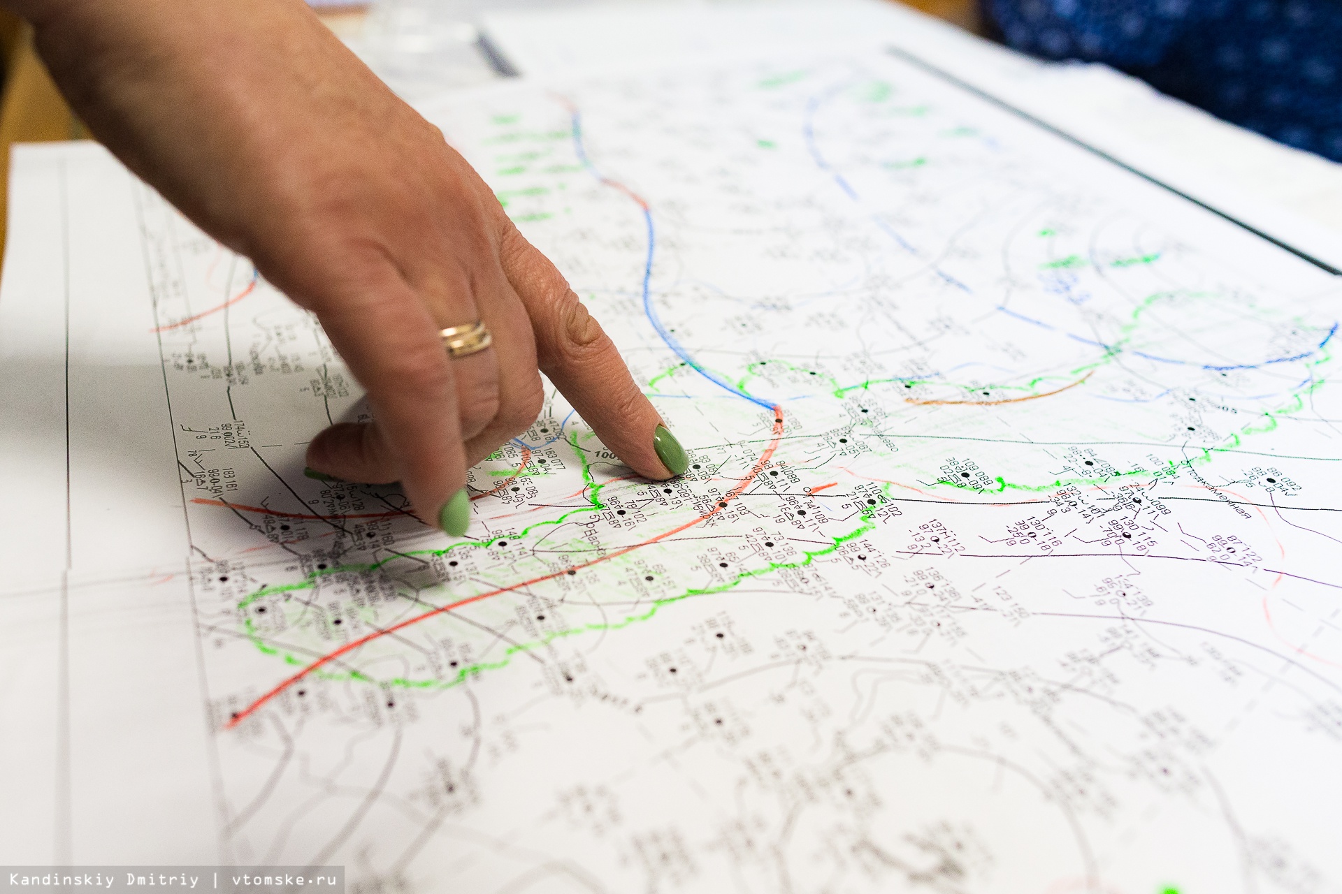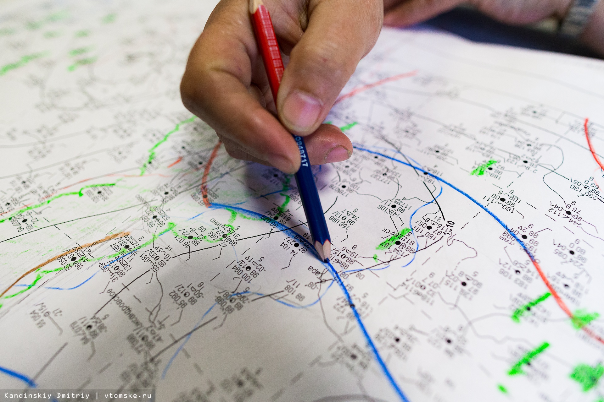 — По карте на три километра (барическая) мы смотрим направление скорости ведущего потока: откуда приходит воздушная масса. Переносим точки на приземную карту и видим, какая погода будет в тот или иной период. Смотрим, откуда пришла воздушная масса, и какая температура будет в той или иной точке, — рассказывает начальник отдела метеорологии Томского гидрометцентра Светлана Рюхтина. — Обработка карт проводится по стандартным правилам, цвета, наносимые на карты, также утверждены стандартами. Синий — холодный фронт, красный — теплый фронт, черные линии — изобары. Вся эта работа называется «поднимать карты».