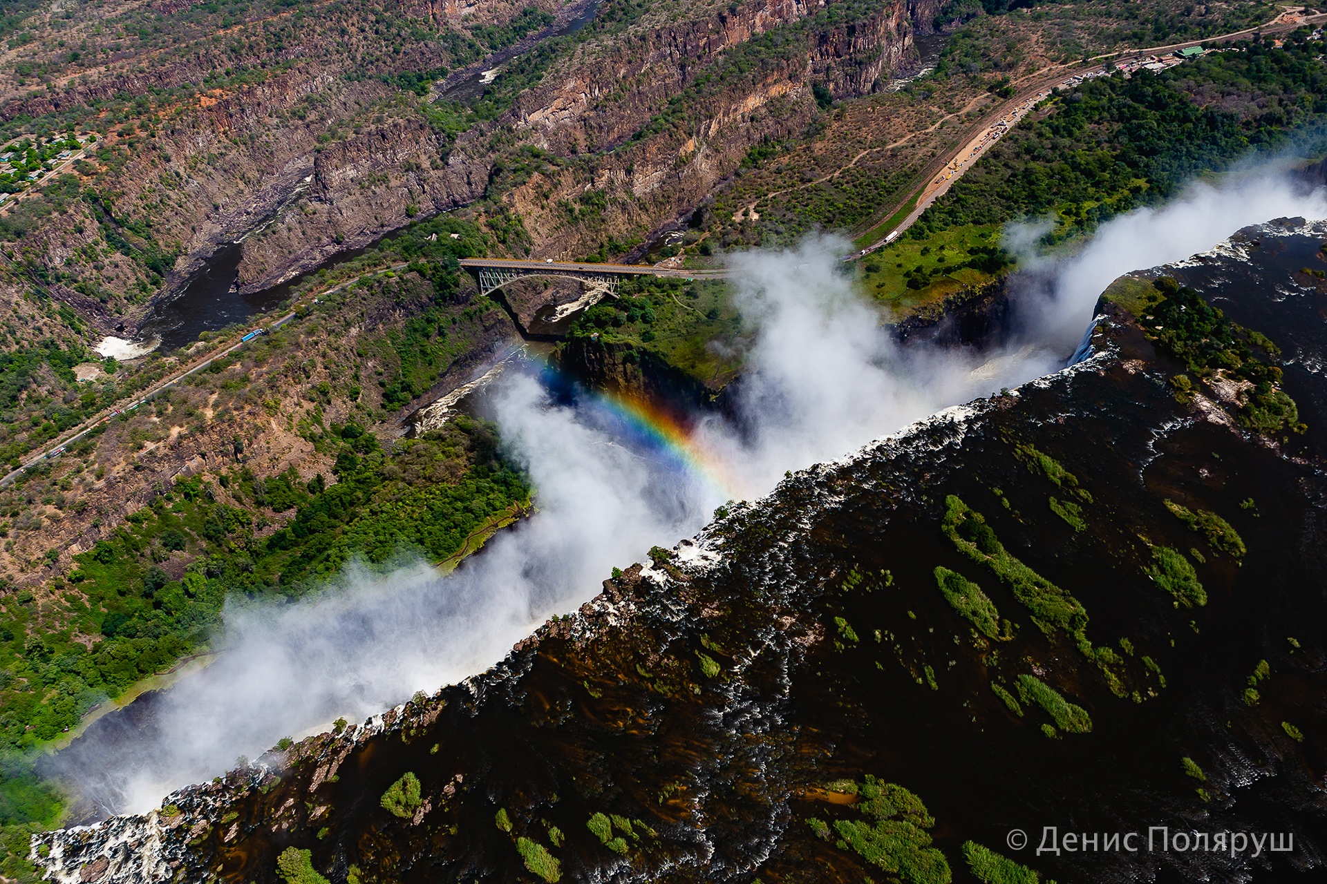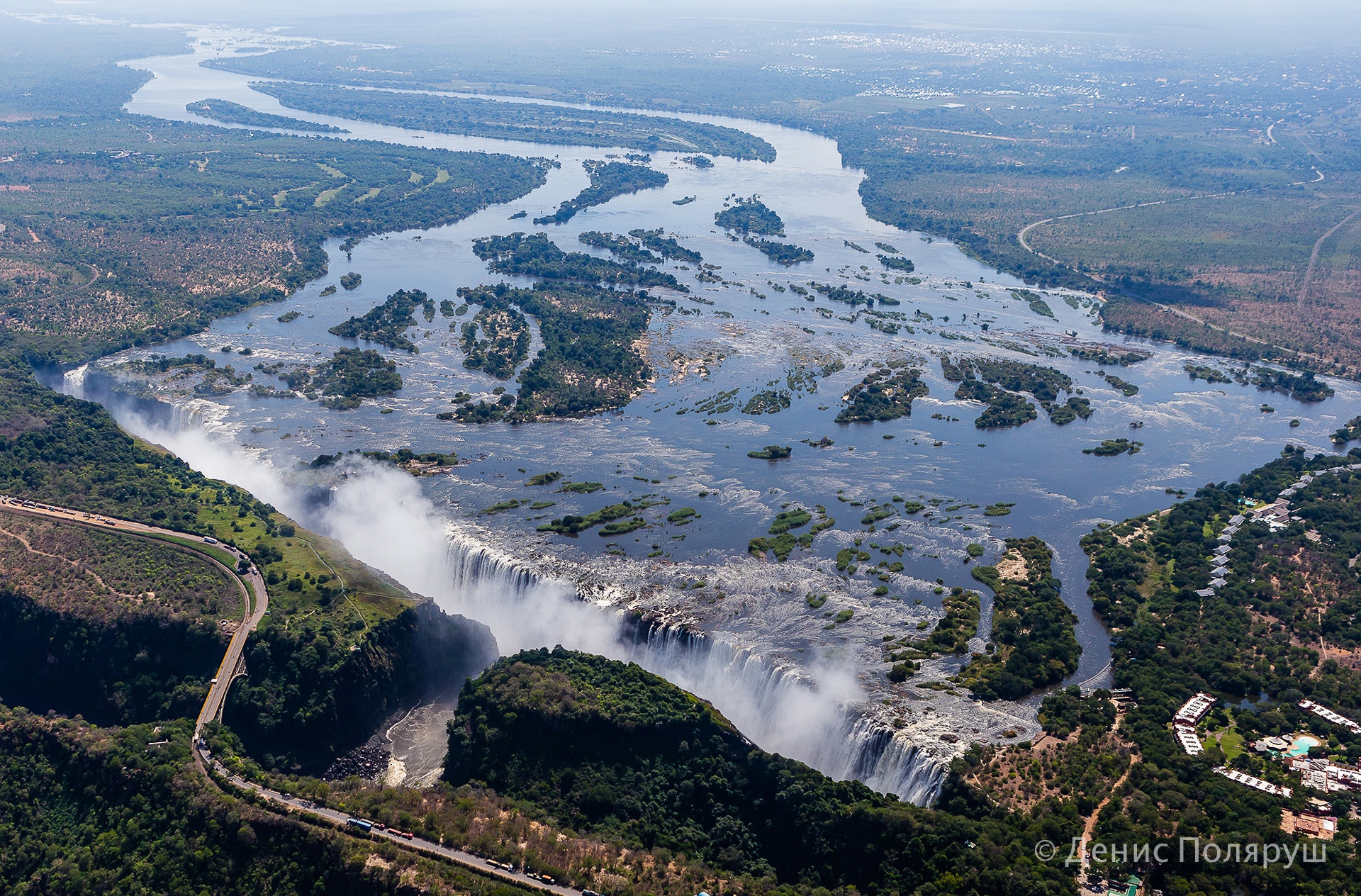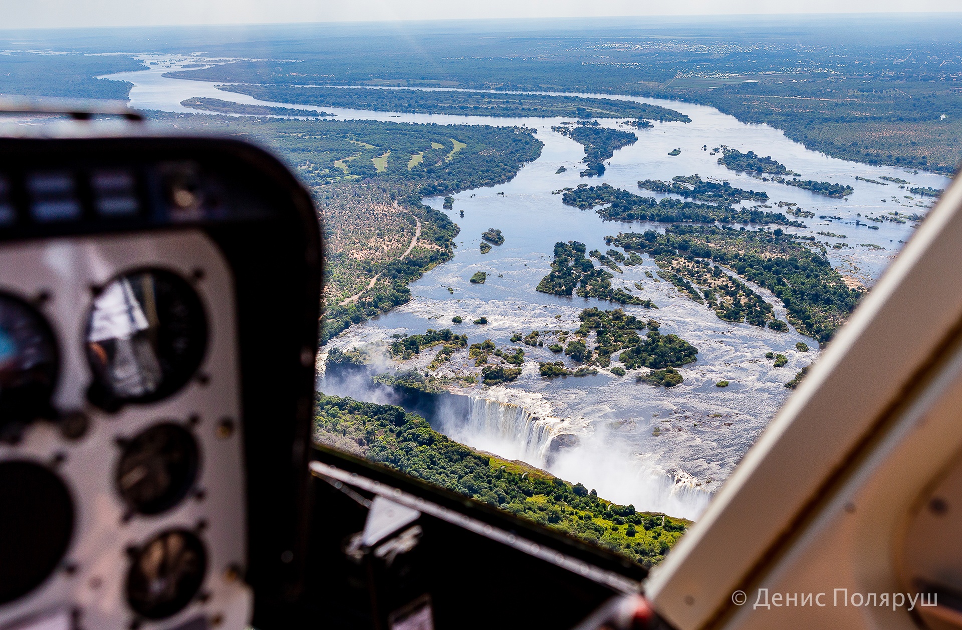 — Отель был в три этажа, балкон номера выходил в сторону водопада, вечером очень хорошо было слышно шум падающей с высоты воды. — говорит томич. — С утра мы полетели на вертолете. Полет — 20-25 минут, стоимость с одного человека — 100 долларов. Уже американских, про зимбабвийский доллар тут можно забывать — не принимают. Мы разделились на две группы, по четыре-пять человек в вертолет. Нам очень повезло с погодой! Водопад расположен на границе двух стран: Замбии и Зимбабве. Вертолет летает туда-сюда, проблем с нарушением воздушного пространства нет. Во время нашего пребывания там, в апреле, водопад был на пике полноводности. Он длится несколько месяцев, а не в сезон сильно высыхает, виды уже не те.