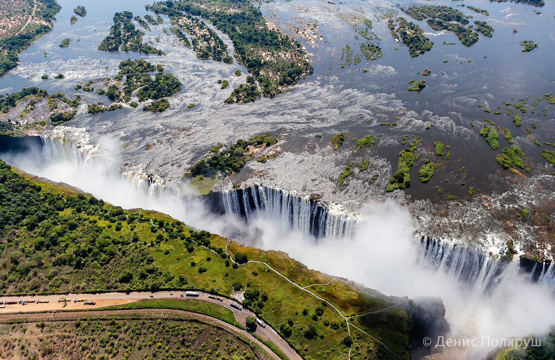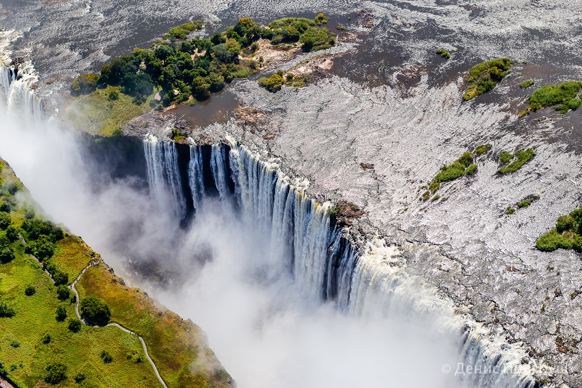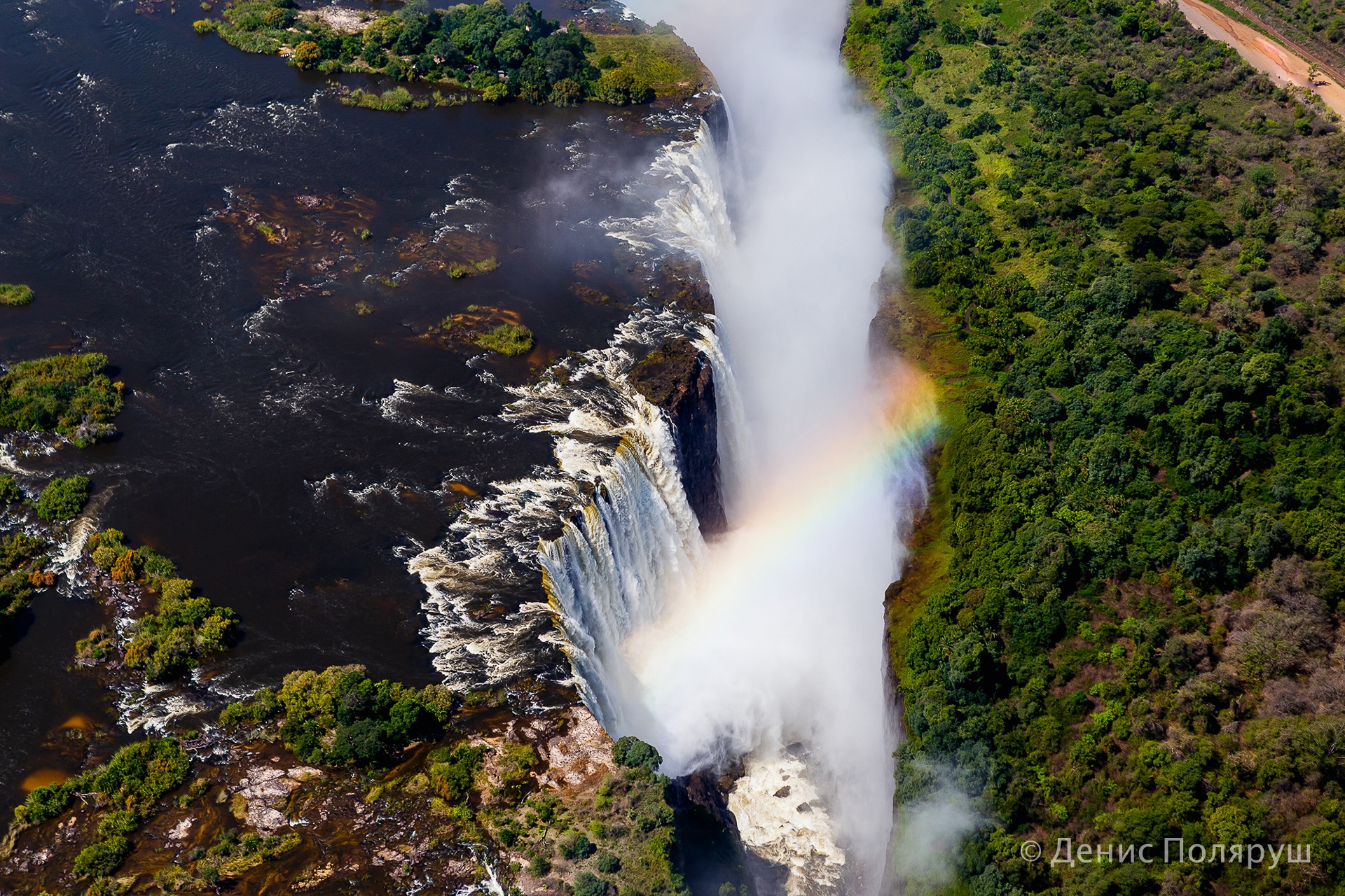 — Отель был в три этажа, балкон номера выходил в сторону водопада, вечером очень хорошо было слышно шум падающей с высоты воды. — говорит томич. — С утра мы полетели на вертолете. Полет — 20-25 минут, стоимость с одного человека — 100 долларов. Уже американских, про зимбабвийский доллар тут можно забывать — не принимают. Мы разделились на две группы, по четыре-пять человек в вертолет. Нам очень повезло с погодой! Водопад расположен на границе двух стран: Замбии и Зимбабве. Вертолет летает туда-сюда, проблем с нарушением воздушного пространства нет. Во время нашего пребывания там, в апреле, водопад был на пике полноводности. Он длится несколько месяцев, а не в сезон сильно высыхает, виды уже не те.
