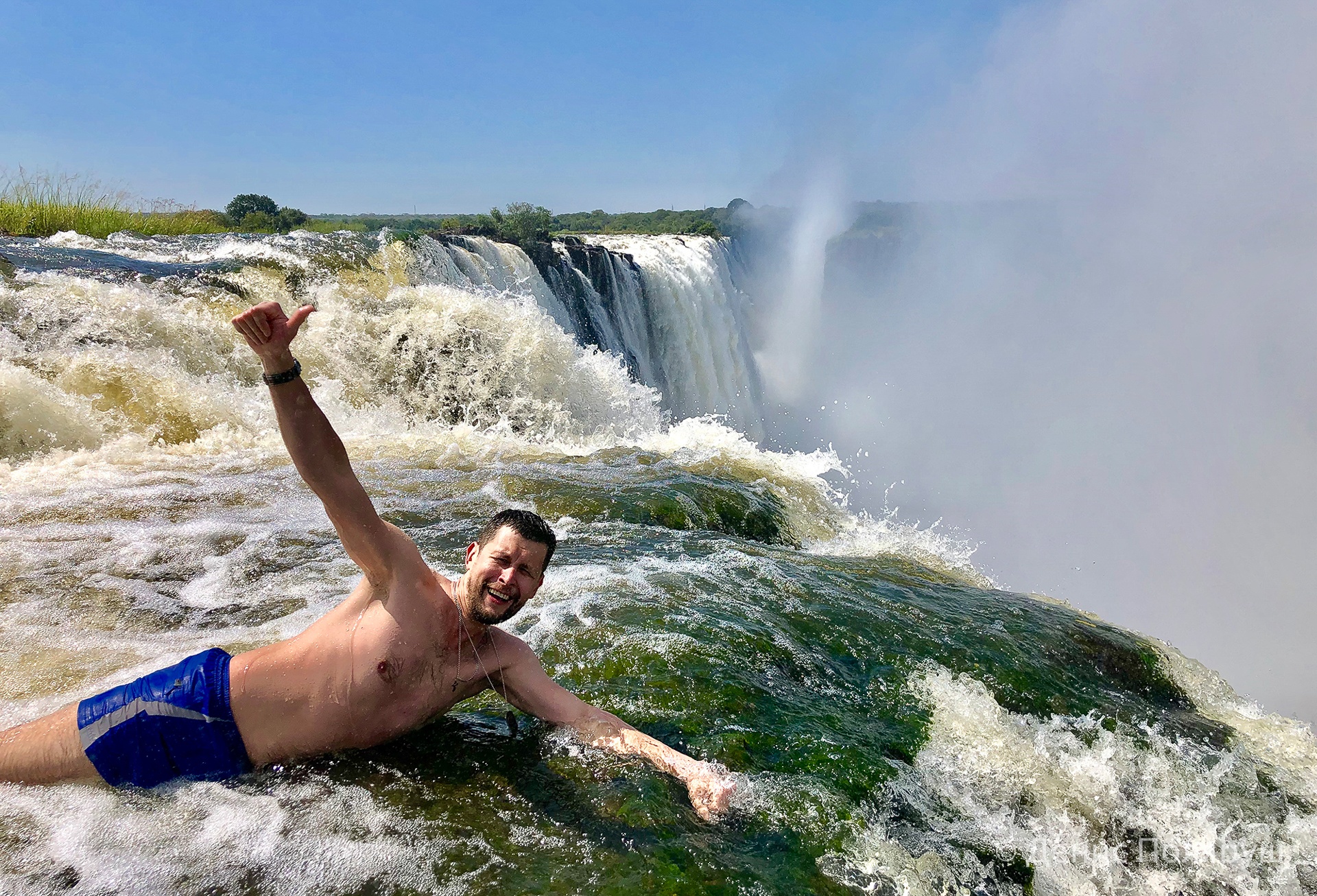 — В верхней точке водопада Виктория, на территории Замбии, есть две естественные выемки — Купель Дьявола и Купель Ангела. Из-за полноводности первая купель была закрыта, но мы смогли побывать в Купели Ангела, она расположена ниже. За обеими купелями — обрыв, — отмечает путешественник. — Туристы приходят туда фотографироваться. Тебя сопровождает специальный человек. Более того, все фото, где люди лежат и как бы свисают вниз, сделаны, когда тебя сзади держат за ноги. По сути, твоя жизнь в этот момент зависит от этого человека. Также там натянута веревка, за которую можно успеть зацепится, если тебя начнет сносить. Но таких случаев уже давно не было.