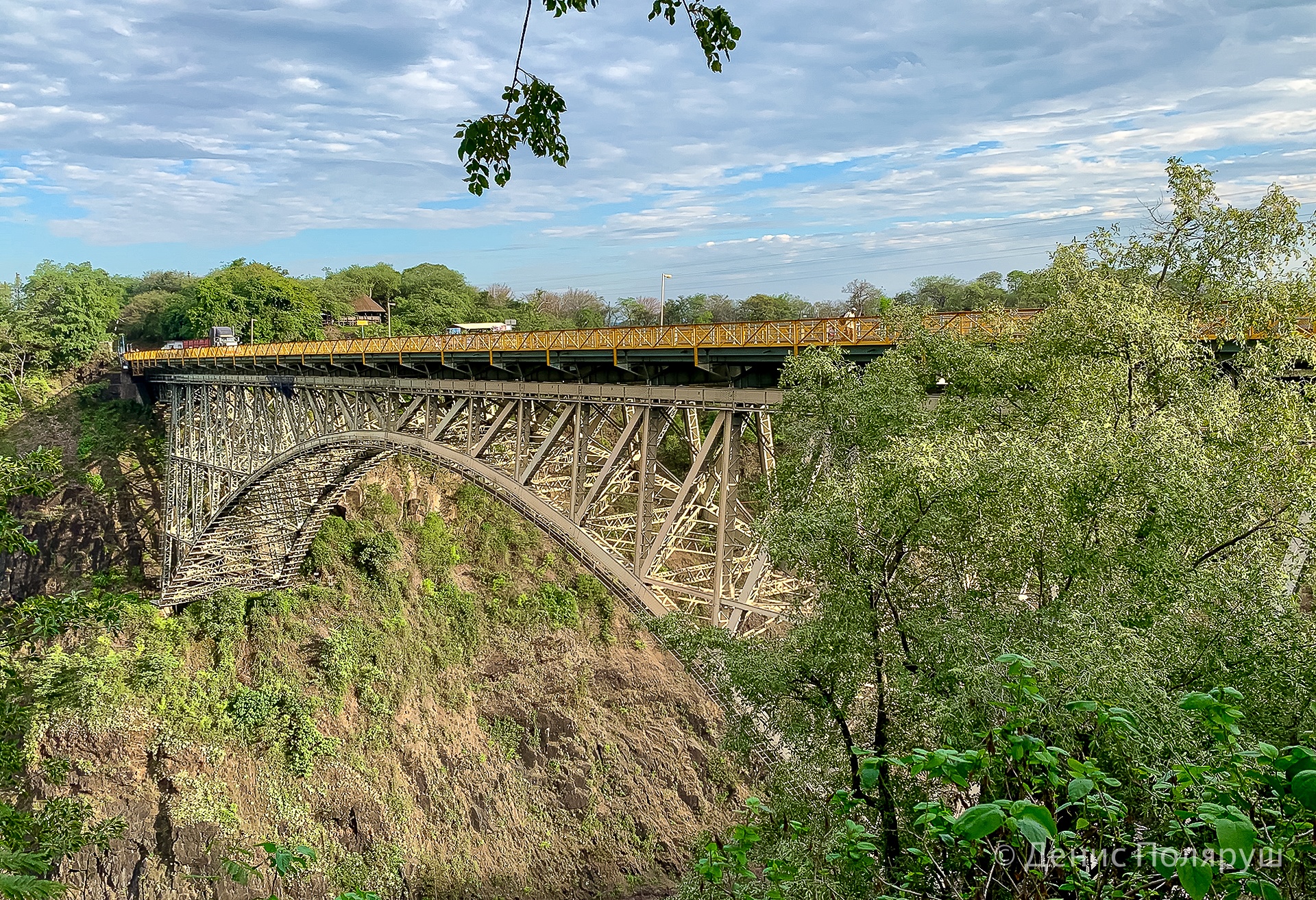 — Побывали на мосту через реку Замбези. Он соединяет Замбию и Зимбабве. По нему можно передвигаться как пешком, так и на автомобилях. Также по нему проложены рельсы для поездов. По мосту можно перейти из одной страны в другую, есть погранпункт.