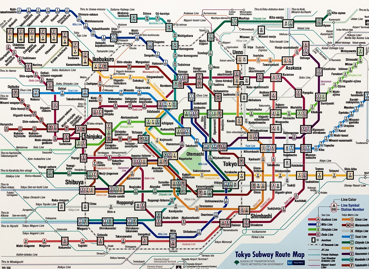 Состоит метро из линий двух независимых компаний Tokyo Metro (частная) и Toei (государственная). Эти две сети полностью разделены, но на общей карте они переплетаются. Также в общую карту интегрированы поезда и монорельсы.