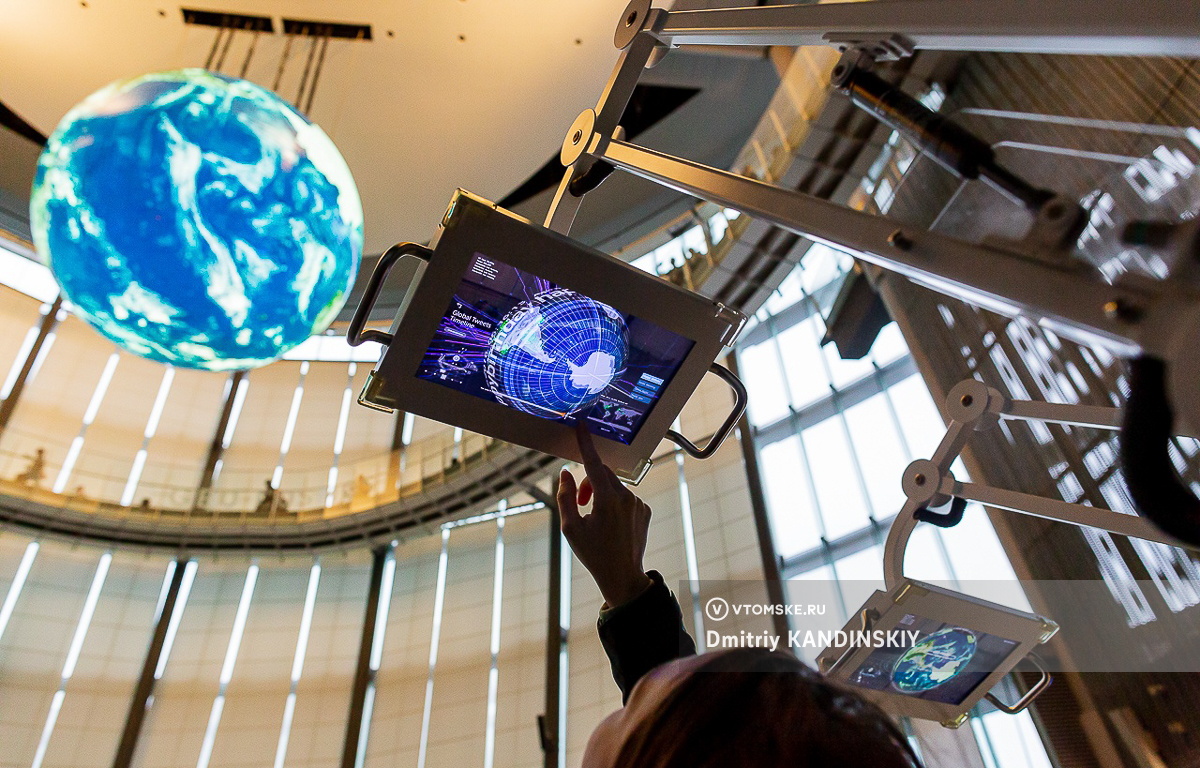 В центре музея на самом верху висит огромный «земной шар», собраный из экранов. На модели постоянно транслируется информация о передвижении ветра, температуре воздуха, которая поступает напрямую с метеостанции.
