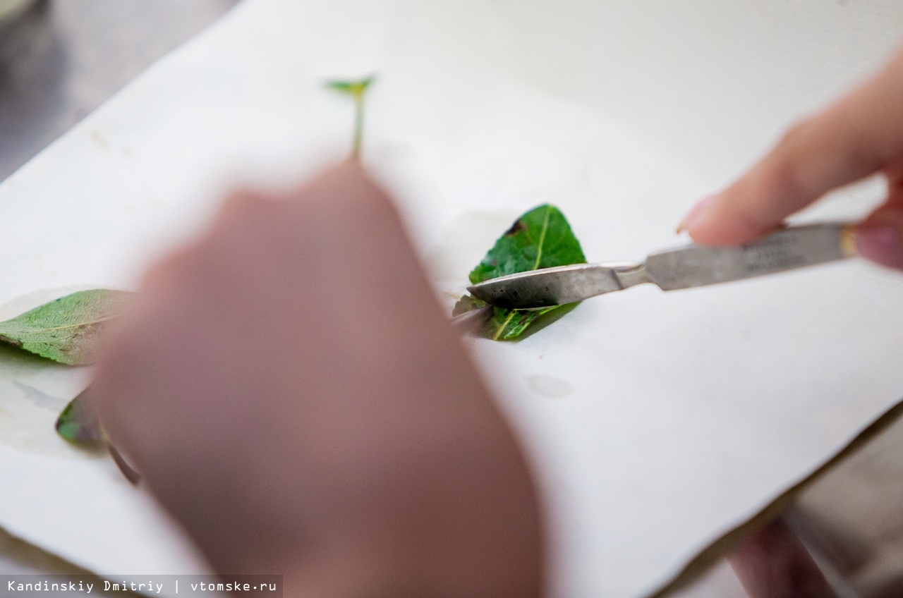 Листочки разрезаются на несколько частей вдоль продольной жилки. Нужны только свежие срезы, поясняет сотрудник лаборатории.
