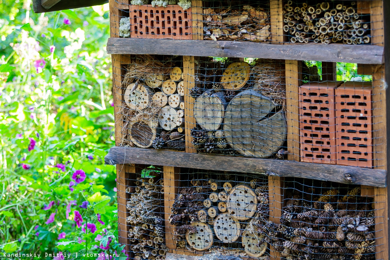 Почти в конце тропы есть отель для насекомых. Это специальное сооружение, построенное в виде домика для привлечения разных групп насекомых. Домик наполнен всевозможными природными материалами: камень, бревна, кора, стебли бамбука, шишки. Отверстия, просверленные в материалах, привлекают насекомых, которые оставляют там личинки.