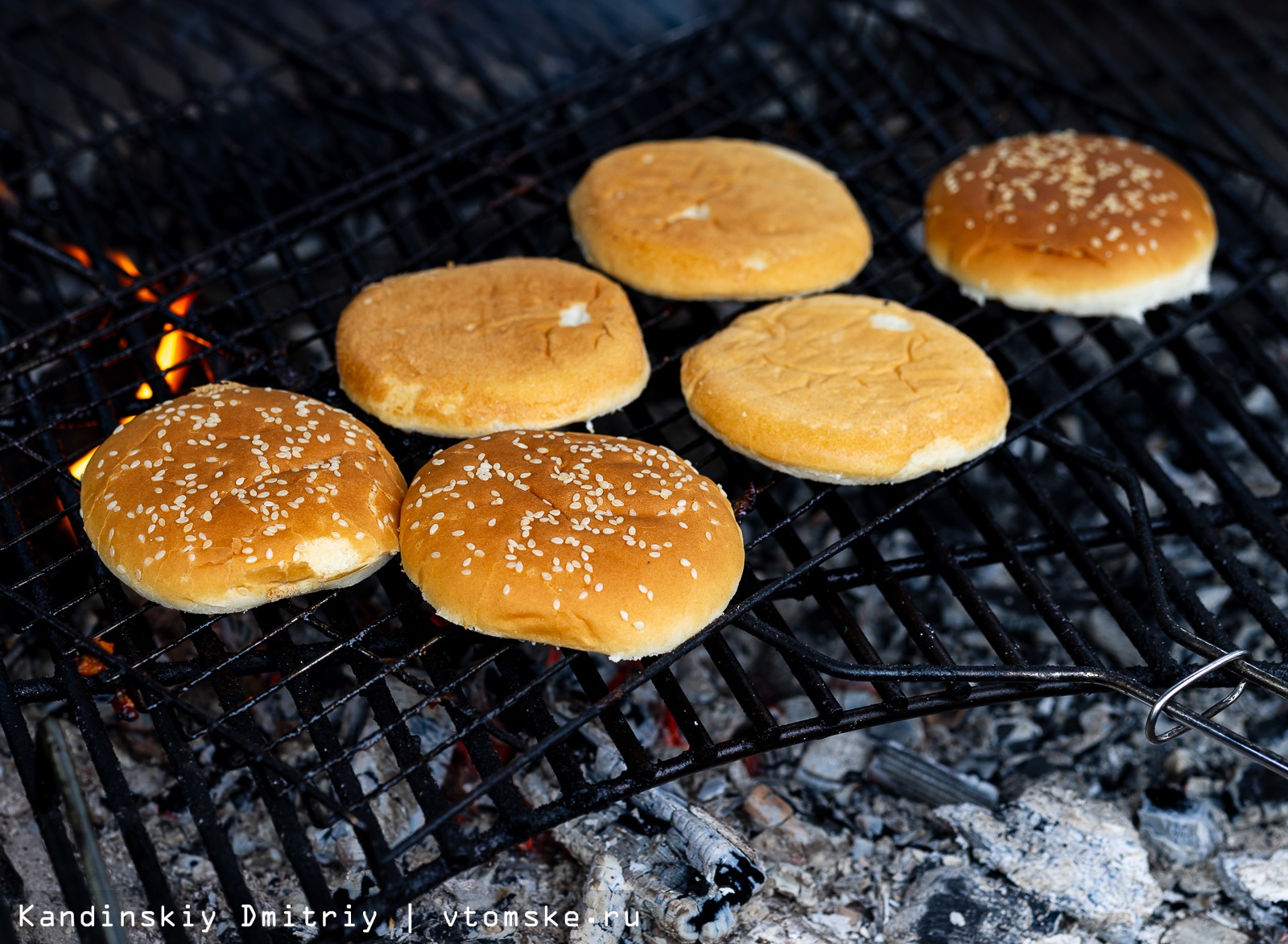 5. Время жарки. Для начала отправим на решетку булочки. Предварительно их нужно разрезать на две части. Время на огне — в районе минуты. Булочки для бургеров сегодня легко найти в магазинах, продаются обычно по три штуки в упаковке.