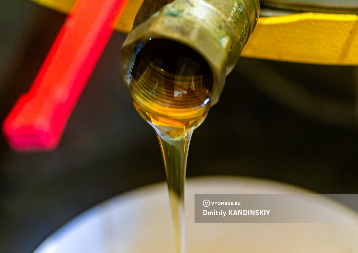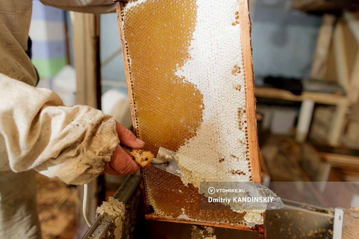 Когда воск срезан, рамки с сотами ставят в медогонку. Под действием центробежной силы сладкий продукт вытекает из сот и стекает по стенкам медогонки в бак. А далее — в тару для хранения.