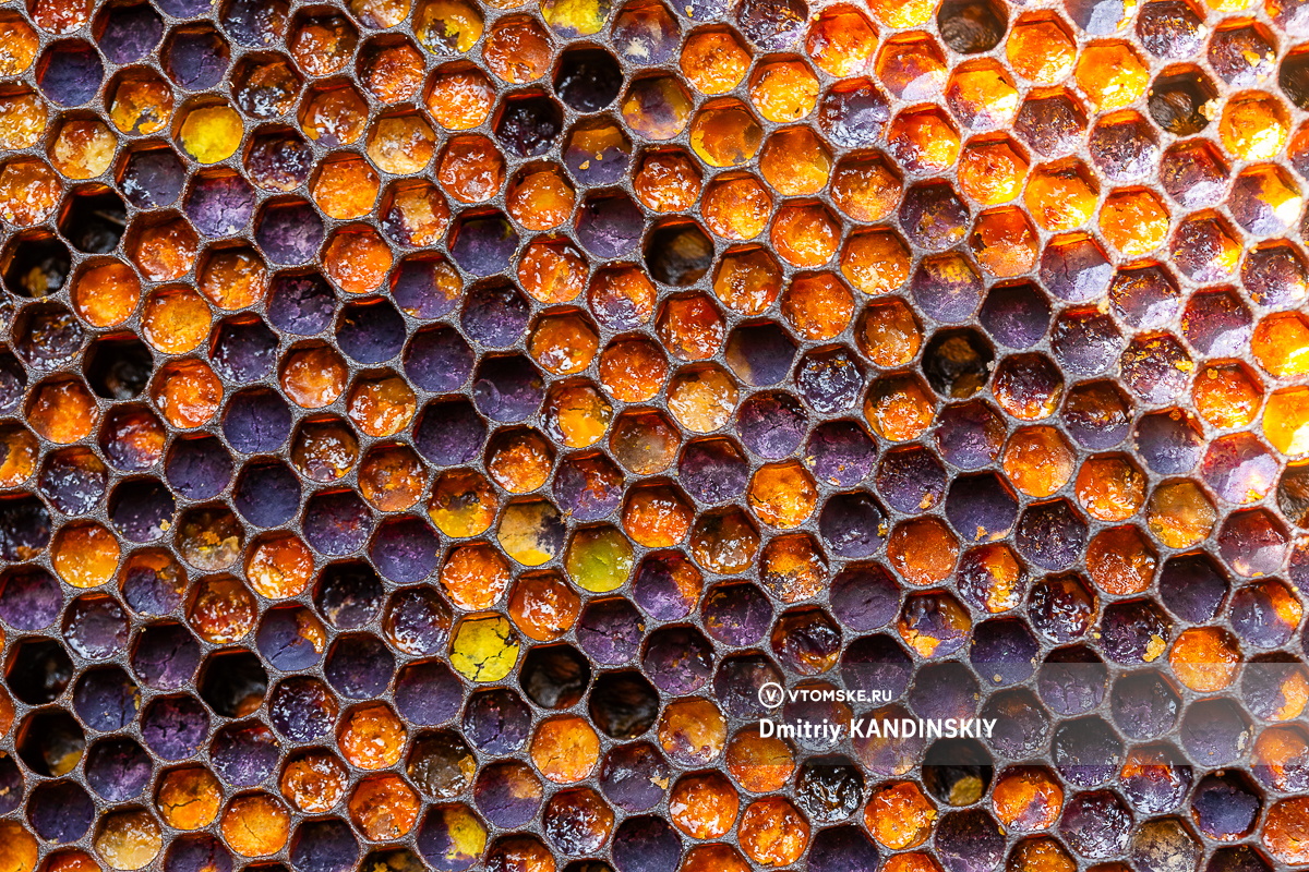 А это соты с пергой — заготовленная и консервированная пыльца, которая является одним из основных источников белка для пчелиного семейства. Перга представляет собой пыльцу, собранную пчелами, которую они уплотняют в ячейки сот и смешивают с небольшим количеством меда или нектара. Затем пчелы закрывают эти ячейки восковыми крышечками для ферментации и хранения.