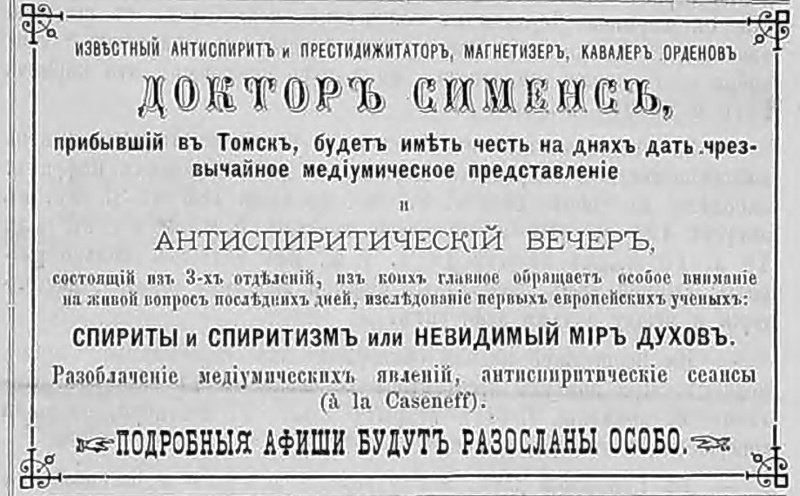 «Так как томская публика, по крайней мере более серьезная ее часть, ждала от антиспирита Сименса чего-то особенного, может быть даже некоторого объяснения спиритических явлений, занимавших в последние годы наши столицы и людей таланта и науки, и так как, наконец, те же самые ожидания Сименс будет возбуждать и в других городах Сибири своими анти-спиритическими вечерами, то необходимо дать отчет и познакомить публику подробнее с содержанием экспериментов «доктора», чтобы каждый знал наперед, что он может на «вечере» найти.