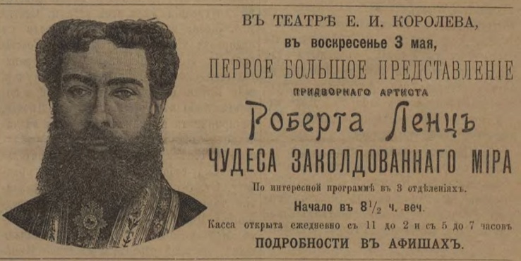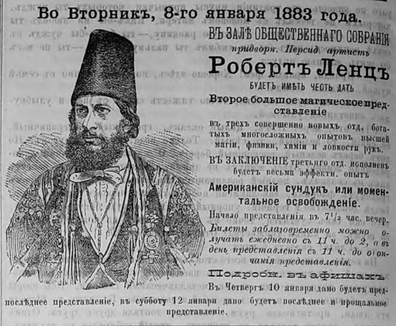 Год спустя, в 1883-м, Томск познакомился со вторым фокусником — «придворным персидским артистом» Робертом Ленцем: благодаря рекламе зрители могли увидеть его внешний облик (молодого красавца-бородача, наверняка жгучего брюнета).