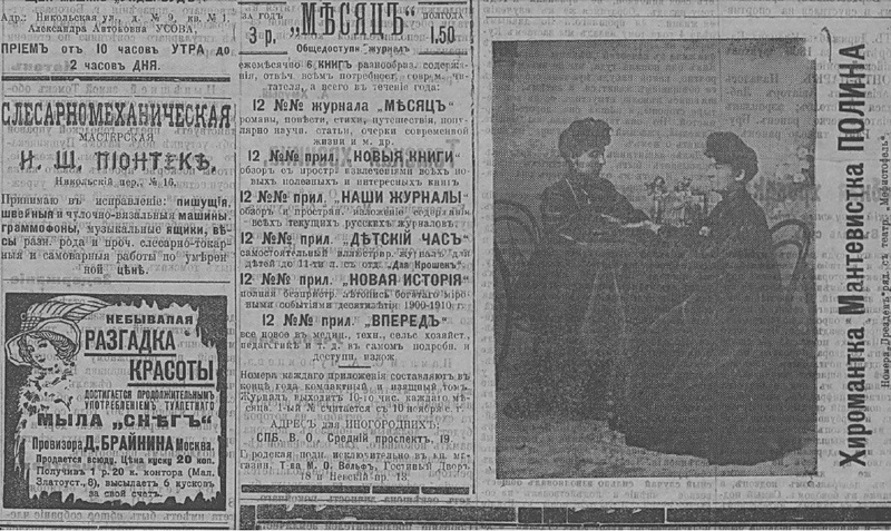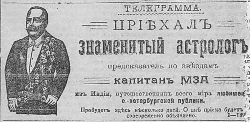 А в 1912 году в разделе рекламных объявлений появилась «телеграмма»: «Приехал знаменитый астролог, предсказатель по звездам капитан МЗА из Индии, путешественник всего мира, любимец санкт-петербургской публики. Пробудет здесь несколько дней. О дне приема будет своевременно объявлено» (СЖ. 1912. № 26) – причем опять же с фотографией.
