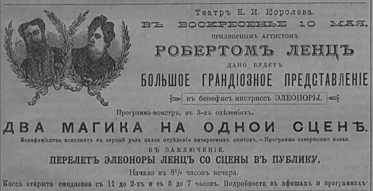 «Театр Е.И. Королева, в воскресенье 10 мая. Придворным артистом Робертом Ленцем дано будет грандиозное представление в бенефис мистрисс Элеоноры. Программа-монстр, в 3-х отделениях.