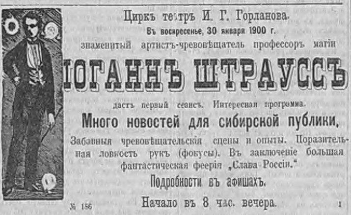 В 1900 году в цирке-театре И.Г.Горланова с воскресенья, 30 января, начались «представления знаменитого артиста-чревовещателя Иоганна Штраусса» (СВ. 1900. № 21): в следующем номере желающие могли даже увидеть его изображение.