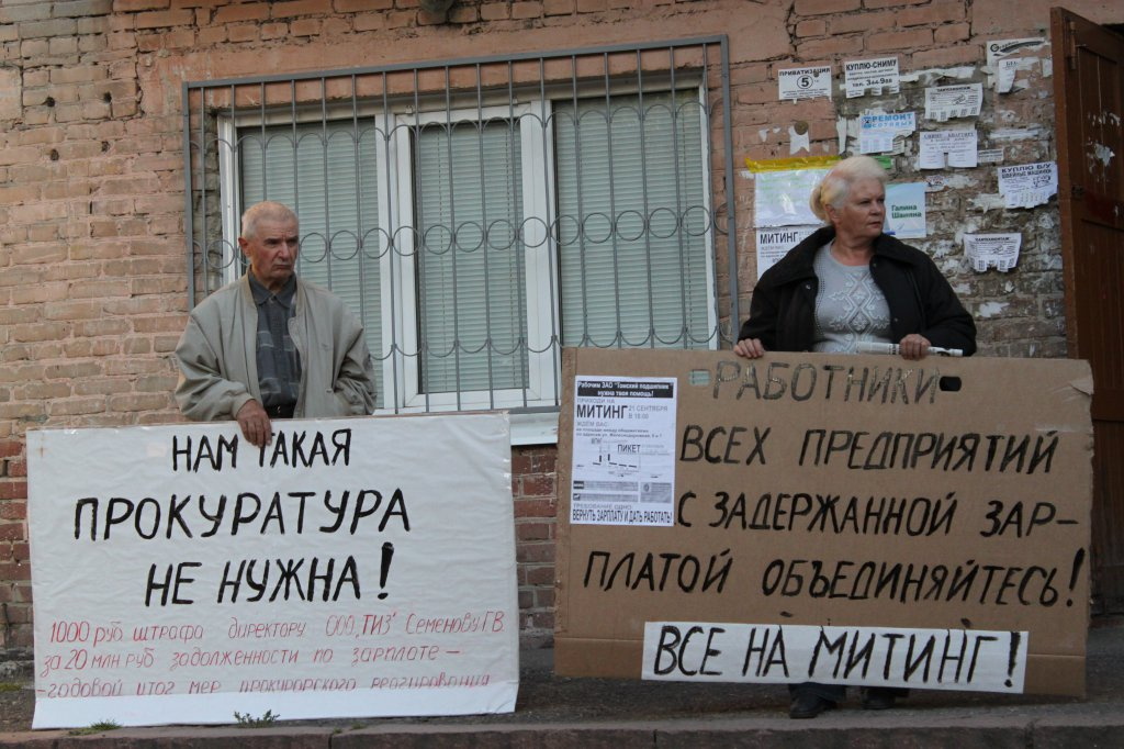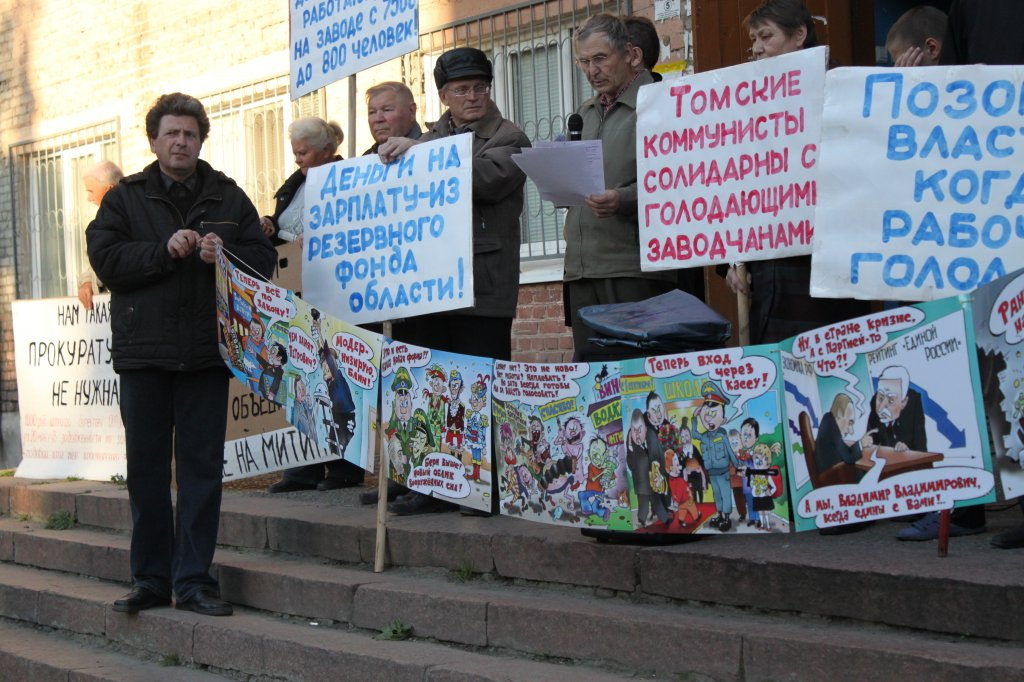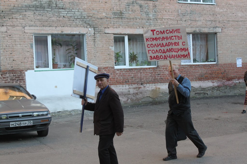 Предыдущую протестную акцию рабочие провели в конце июля. С тех пор на предприятии ничего не изменилось: группа рабочих вновь объявила голодовку, пытаясь добиться выплаты долгов по заработной плате, остальные заводчане вышли на митинг. В связи с этим томские коммунисты развернули на Новособорной алые флаги и плакаты в поддержку сотрудников завода. От самих рабочих пришел отстаивать свои права только один представитель.