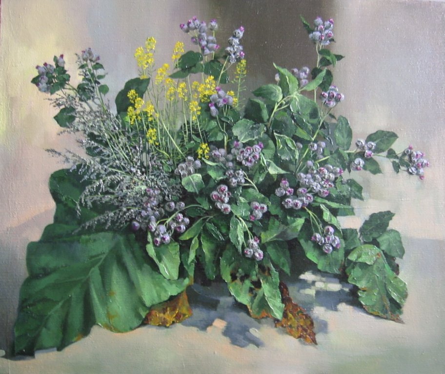 — У меня уже шесть натюрмортов с лопухами, три из них представлены здесь, — говорит Светлана. — Планирую написать еще несколько картин и сделать отдельную выставку под названием «Его величество лопух».