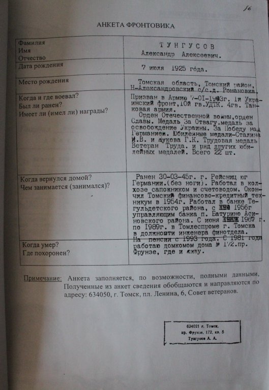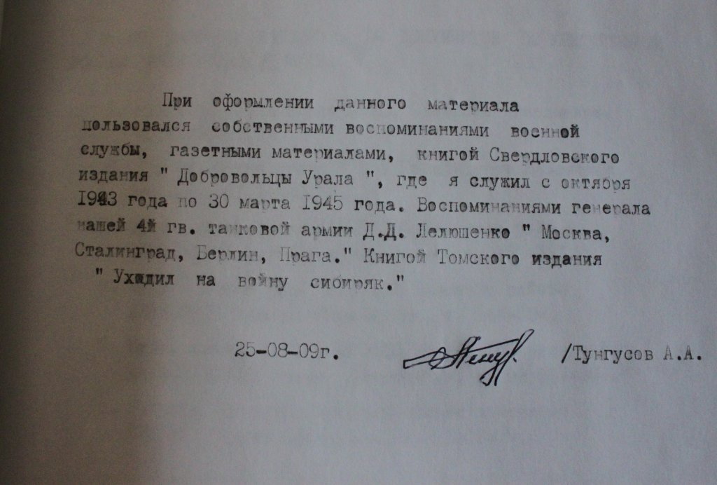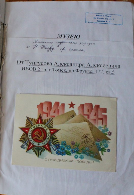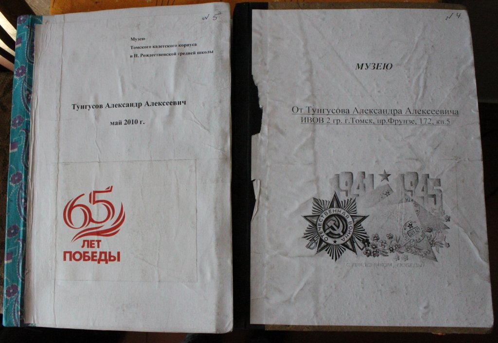 Так начинается обращение ветерана Александра Алексеевича Тунгусова к учащимся Томского кадетского корпуса, открывающее его памятный подарок — уникальные папки с документами о Великой Отечественной войне. Их ветеран собирал собственноручно более десяти лет: печатал на машинке личные воспоминания, вырезал газетные публикации, запрашивал архивные справки, переписывался с однополчанами. Копии всех этих документов переданы также музею в деревне Новорождественка, на малой родине Александра Тунгусова, и ряду школ Томска. Чтобы помнили…