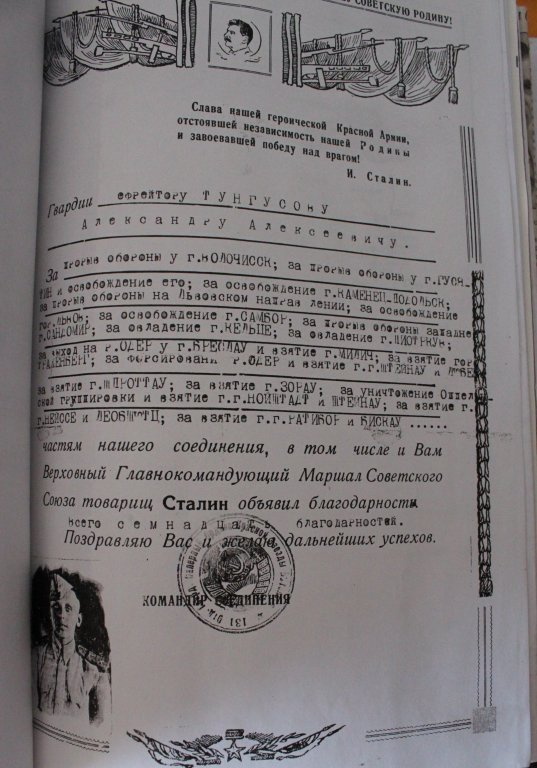 Почти так же случилось и в день последнего боя Александра Тунгусова — 30 марта 1945 года. До Берлина десятый гвардейский корпус не дошел 80 километров — был переброшен на юг, на границу с Чехословакией. Здесь, в городе Рейсниц, солдатам пришлось отступать. Отделение успело отойти, а Александр Алексеевич — нет. Оборону он держал в доме, уничтожил двоих врагов, а при попытке уйти попал под пулеметную очередь. Его ранило, и он упал. Немцы приняли его за мертвого и не тронули, а Тунгусов затем ползком скрылся за углом дома, где его подобрали свои и унесли в подвал. Тяжело раненым он трое суток оставался там, пока город не освободили русские войска. Затем в госпитале в Германии ему ампутировали правую ногу. Потом были госпитали на родине, а домой Тунгусов вернулся 24 июня 1946 года. Инвалидом.