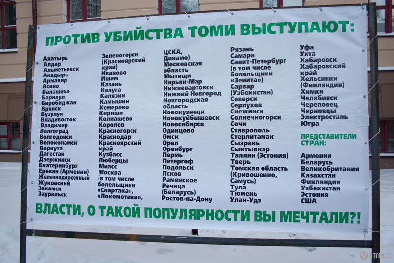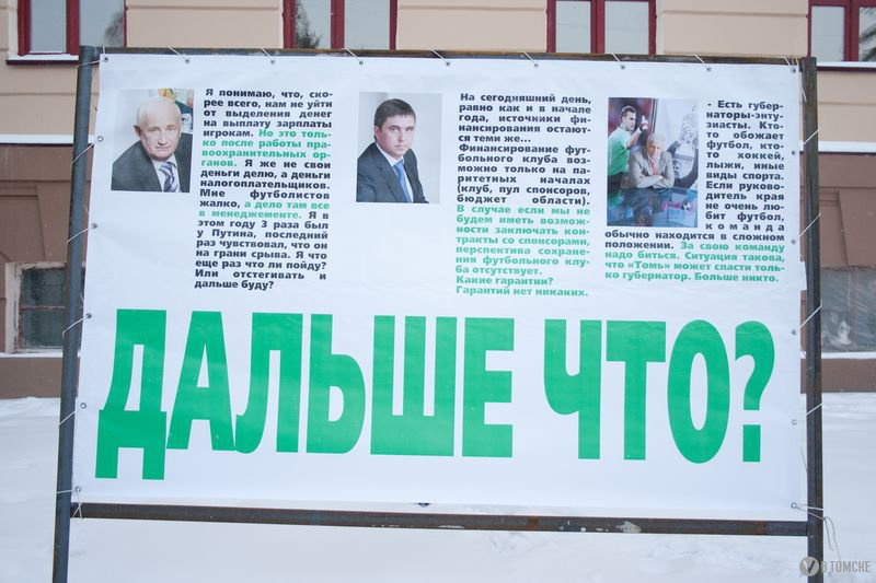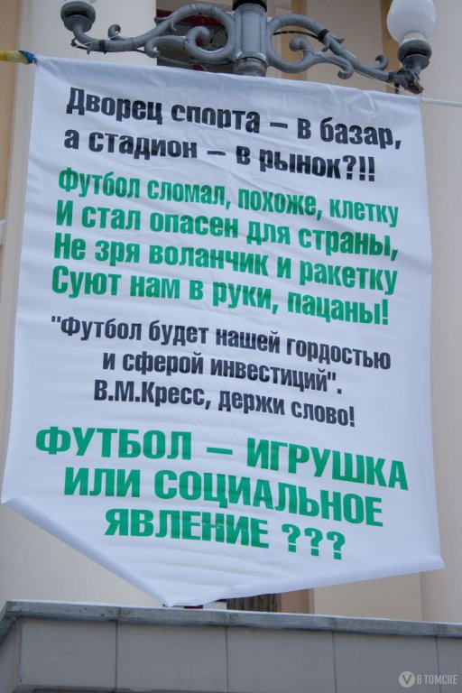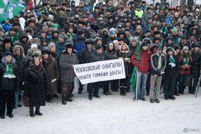 — Всем набило оскомину выражение «Закройте «Томь» — постройте садики», — сетует болельщик Сергей Петров. — Но почему-то те, кто так говорят, считают что наша команда — этакий тиран, собирающий дань со всех остальных сфер. Я думаю, все горожане согласятся: проблема отсутствия садиков или чего-то еще — это проблема не «Томи», а городской власти. Сколько мы добываем и сколько оставляем здесь? Оставь процентов на десять больше, хватило бы всем: и на садики, и на бассейны, и на дороги. Но чиновники предпочитают, видимо, боясь за свои места, все перекачивать в Москву и Питер. И в итоге у «Зенита» стадион за бешеные миллиарды долларов, а у «Томи» народ на улицы выходит. Мы здесь собрались не для того, чтобы клянчить деньги, а для того, чтобы показать: проблема есть. И проблему эту властям нужно решать, а не сливать команду по-тихому, виня во всем менеджмент. Плохие менеджеры? Так увольте их, посадите, если есть за что.