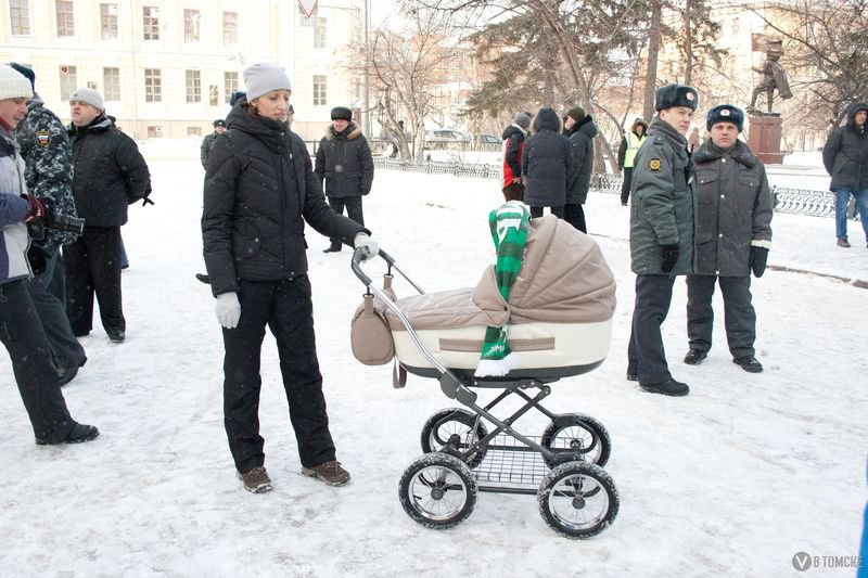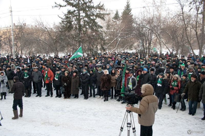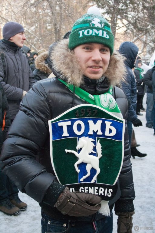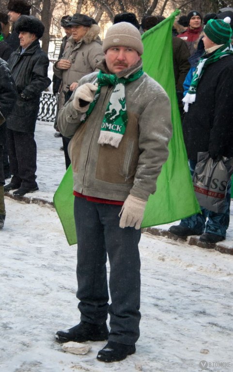 Где-то я уже это видел… Именно такое ощущение сложилось у меня, когда сегодня около 12 часов дня наблюдал, как к зданию СФТИ со всех сторон небольшими «ручейками» начал стекаться разномастный народ. Суетливые подростки, семейные пары с потомством, пенсионеры, студенты. Всех их объединяло одно — практически на каждом была атрибутика зеленого цвета. Точно так же в июле 2009 года под те же бодрые «футбольные» песни начинался первый в Томске митинг болельщиков. Ноябрь-2011 собрал под лозунгами о спасении большого футбола идентичную публику. Разница была лишь в декорациях наступившей зимы.