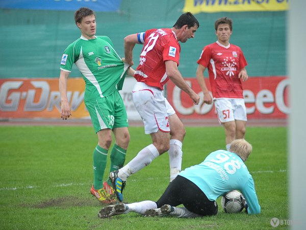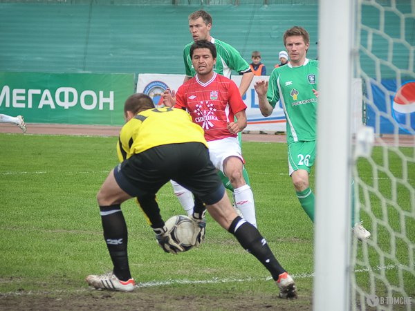 Пока же надо было «хлопнуть дверью» на прощание. Причем как «Томи», так и кабардино-балкарскому «Спартаку». Однако наилучшей иллюстрацией первых минут двадцати игры являются, на мой взгляд, слова одного из болельщиков: «Вылетаем в Первую лигу, а тут уже вторая корячится, по-моему». Что и говорить, стартовый отрезок встречи томичи вновь проспали. Крепче всех задремал Петр Вашек: голкипер «Томи», к которому практически не было нареканий во всех сыгранных им матчах, на этот раз пустил «бабочку». Не умаляю заслуг активного Гуджи Рухайи, который еще в Нальчике в одиночку терроризировал оборону бело-зеленых, — удар у него получился неплохой, но не неберущийся. Как бы то ни было, к пятнадцатой минуте хозяева поля оказались в роли догоняющих. Этот гол оказался первым, пропущенным «Томью» на своей арене в третьем круге.