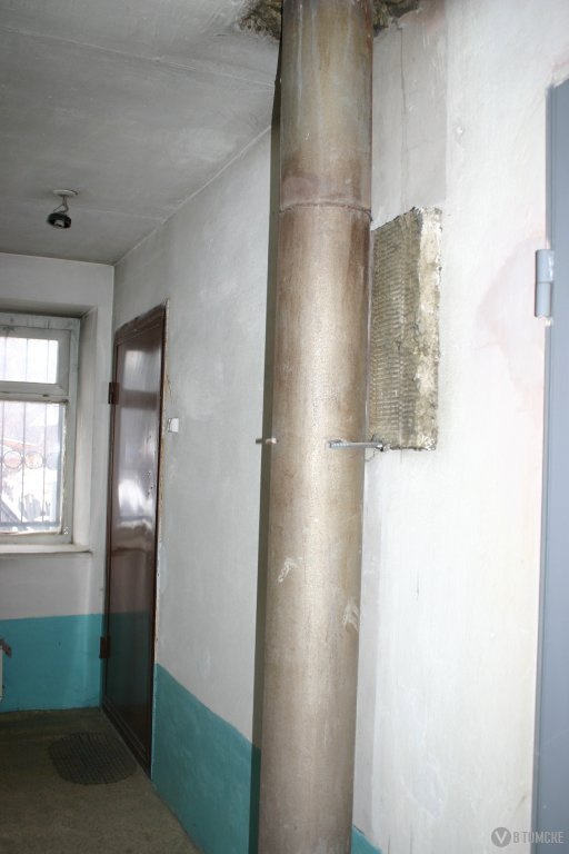 Первое, что бросается в глаза при входе в подъезд, — налет сажи на стенах, полу. Через продолбленные в полу коридоров дыры проходит раскаленная труба — это система отопления, сооруженная без каких-либо проектов-разрешений, и, видимо, даже без приложения мыслительных усилий.