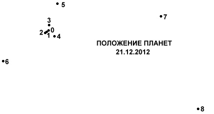 В прилагаемом файле — расположение планет на 21.12.2012 — попробуйте увидеть на картинке парад, у меня не получилось. Цифры — порядковые номера планет по удаленности от Солнца (0 — Солнце).