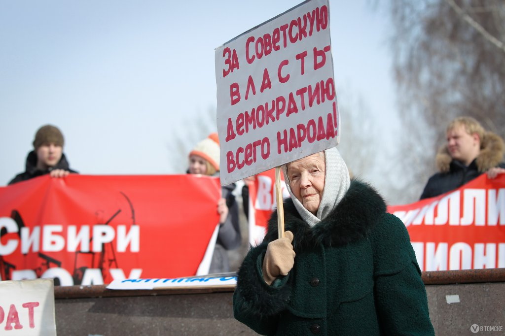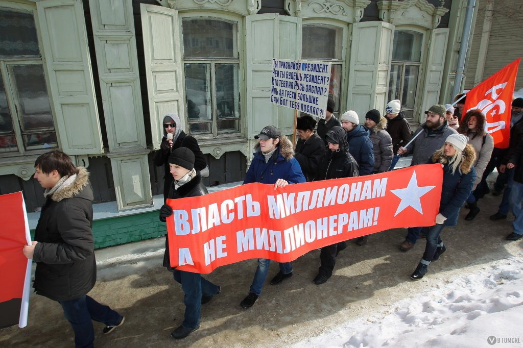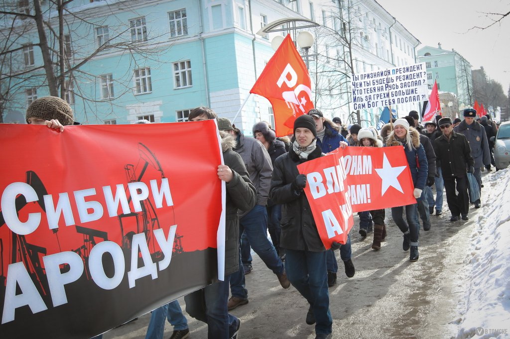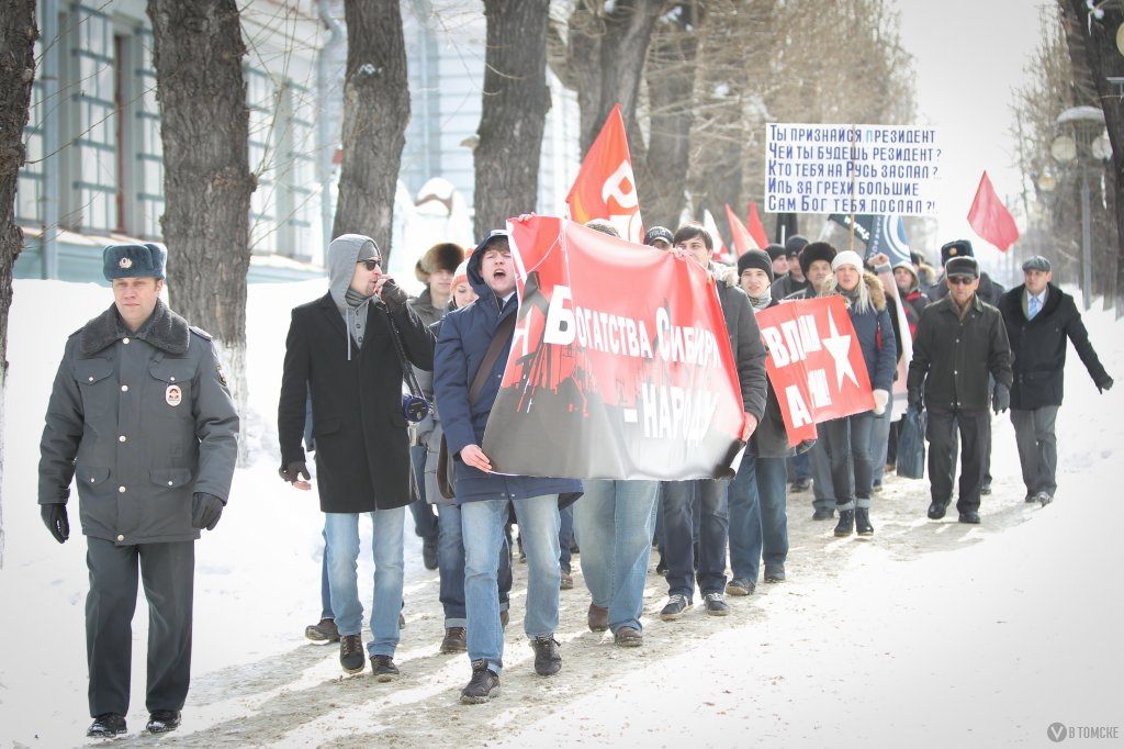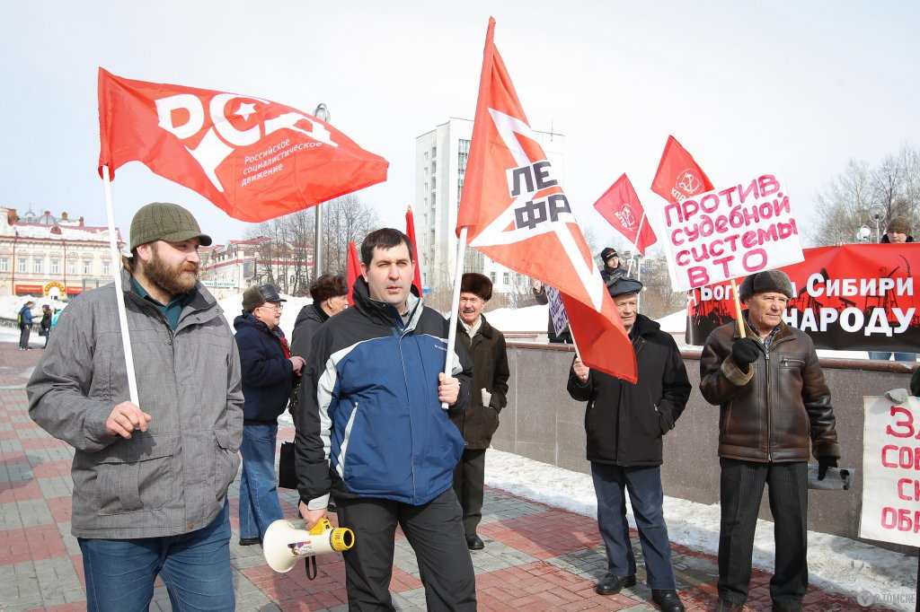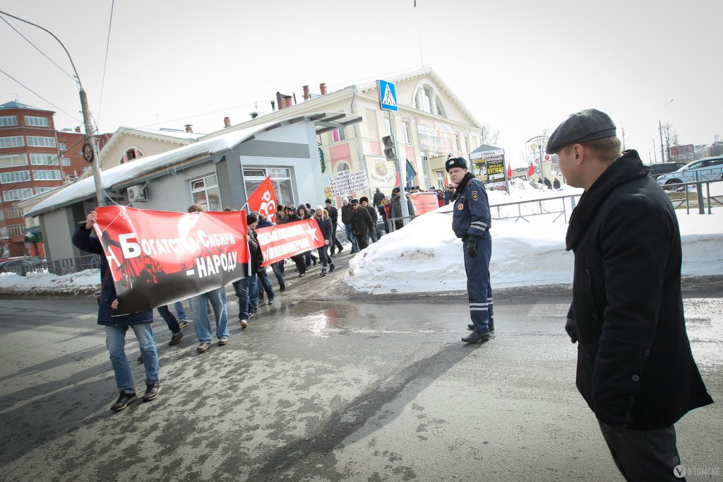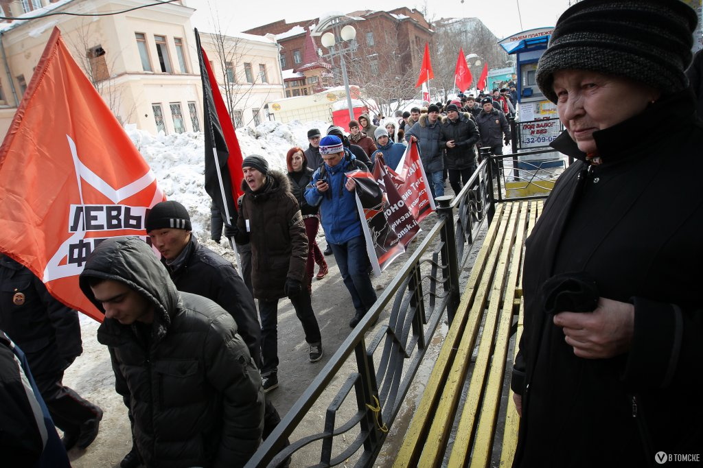 Состав томских протестующих весьма разнородный и веселый: красные флаги КПРФ перемежаются черными флагами пиратской партии и черно-красными с аббревиатурой СКТ, за которой скрываются анархо-синдикалисты. Расшифровывается как «Сибирская конфедерация труда». Впрочем, это не единственные анархисты на этом мероприятии, еще бросается в глаза плакат от неких либертарных коммунистов, проще говоря анархо-коммунистов. Не появились давшие согласие на участие справороссы, но присутствует набирающее обороты движение «Студзащита» и уже известное РДДО. Проигнорировала мероприятие от всего левого блока и «Солидарность», и «Правое дело». Ну, у вторых понятно, в это время полным ходом шла подготовка к смене партийного лидера областного масштаба. Говорят, Салангину просто надоело. А вот первые, видимо, не пришли из осознания собственной значимости: если не мы первые, то тогда вообще без нас.