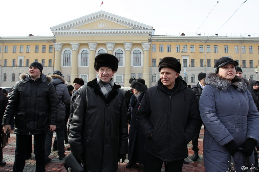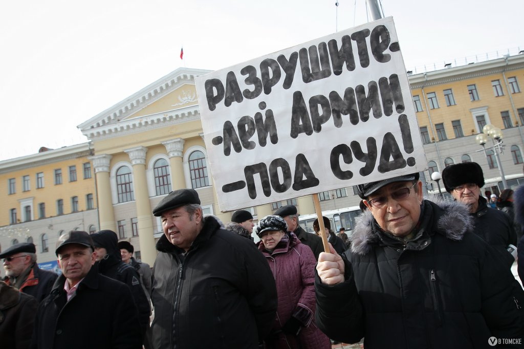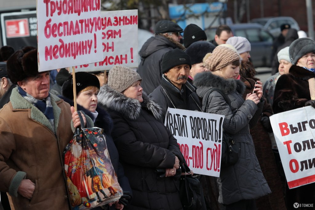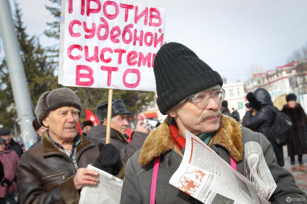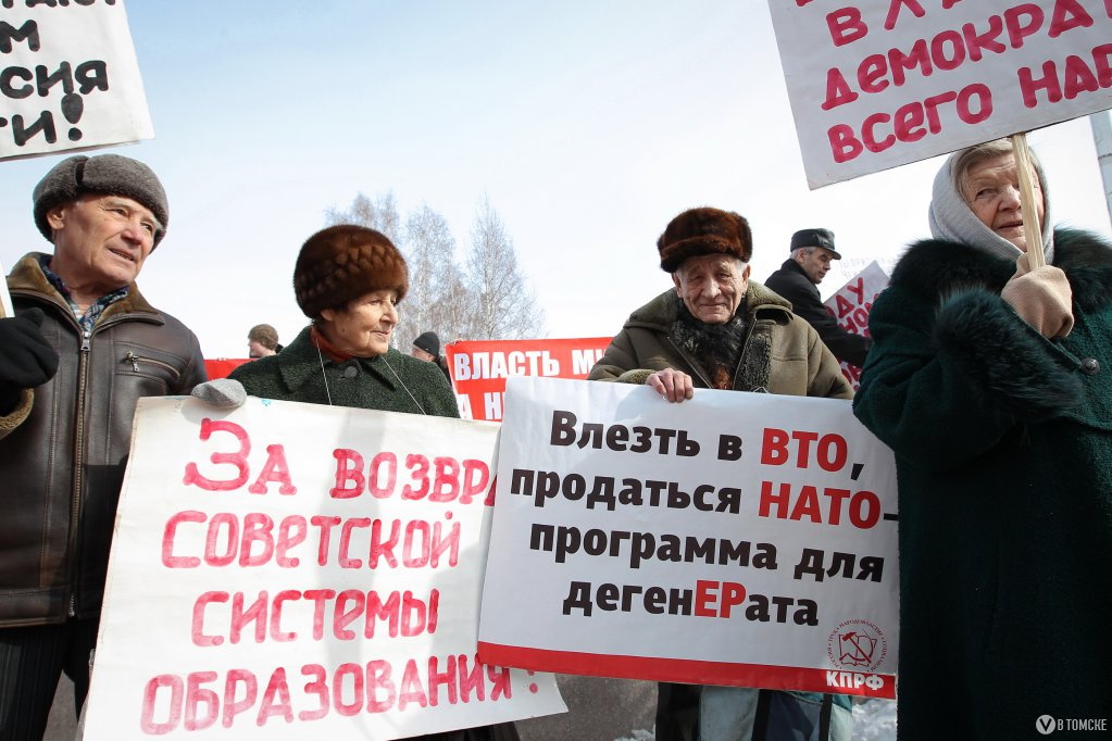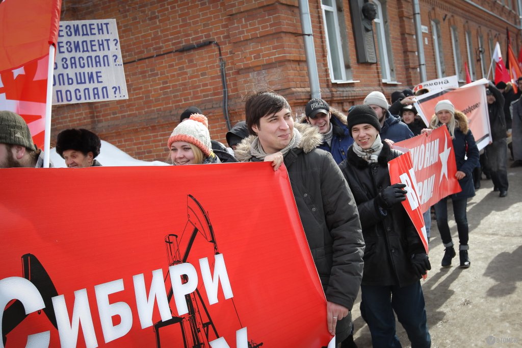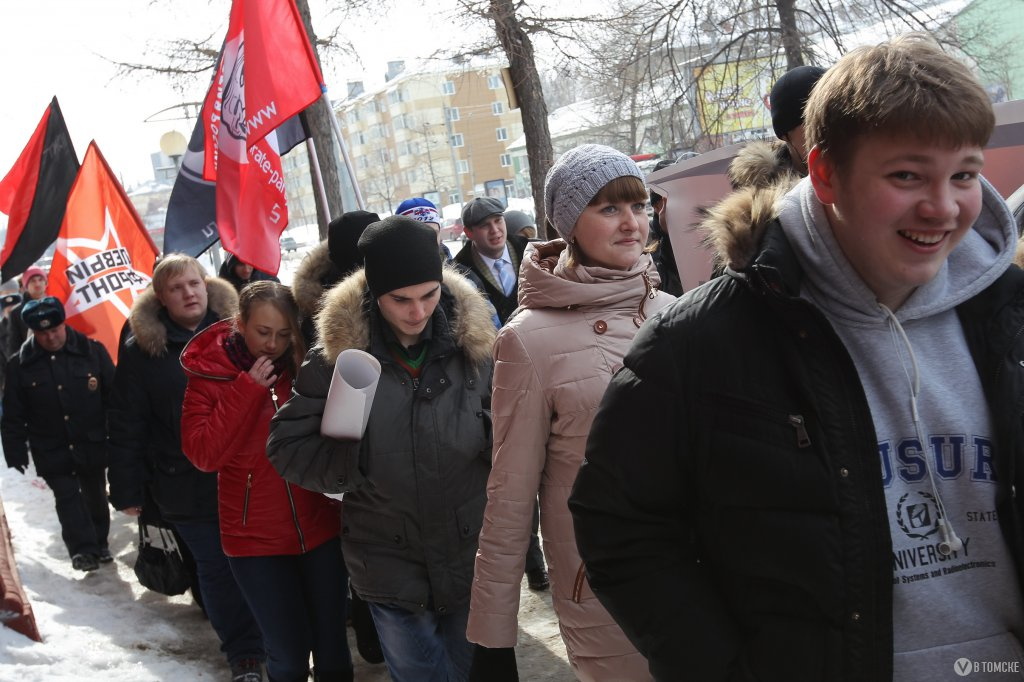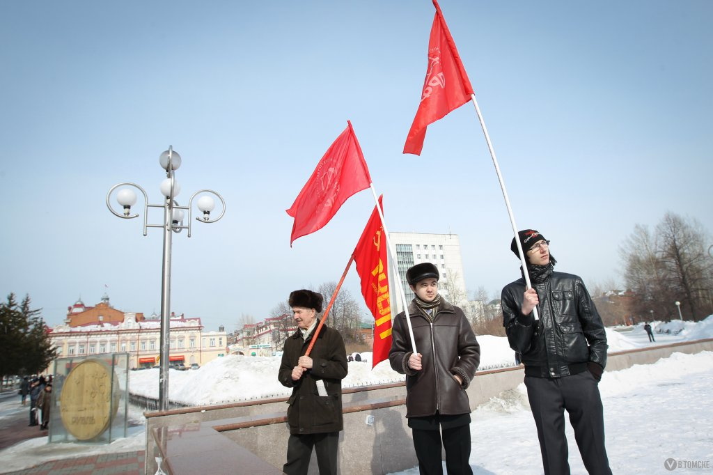 Состав томских протестующих весьма разнородный и веселый: красные флаги КПРФ перемежаются черными флагами пиратской партии и черно-красными с аббревиатурой СКТ, за которой скрываются анархо-синдикалисты. Расшифровывается как «Сибирская конфедерация труда». Впрочем, это не единственные анархисты на этом мероприятии, еще бросается в глаза плакат от неких либертарных коммунистов, проще говоря анархо-коммунистов. Не появились давшие согласие на участие справороссы, но присутствует набирающее обороты движение «Студзащита» и уже известное РДДО. Проигнорировала мероприятие от всего левого блока и «Солидарность», и «Правое дело». Ну, у вторых понятно, в это время полным ходом шла подготовка к смене партийного лидера областного масштаба. Говорят, Салангину просто надоело. А вот первые, видимо, не пришли из осознания собственной значимости: если не мы первые, то тогда вообще без нас.