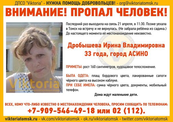 Напомним, жительница Асино Ирина Дробышева последний раз выходила на связь 21 апреля. Позже уехала в Томск на встречу и не вернулась, не забрала ребенка из садика.