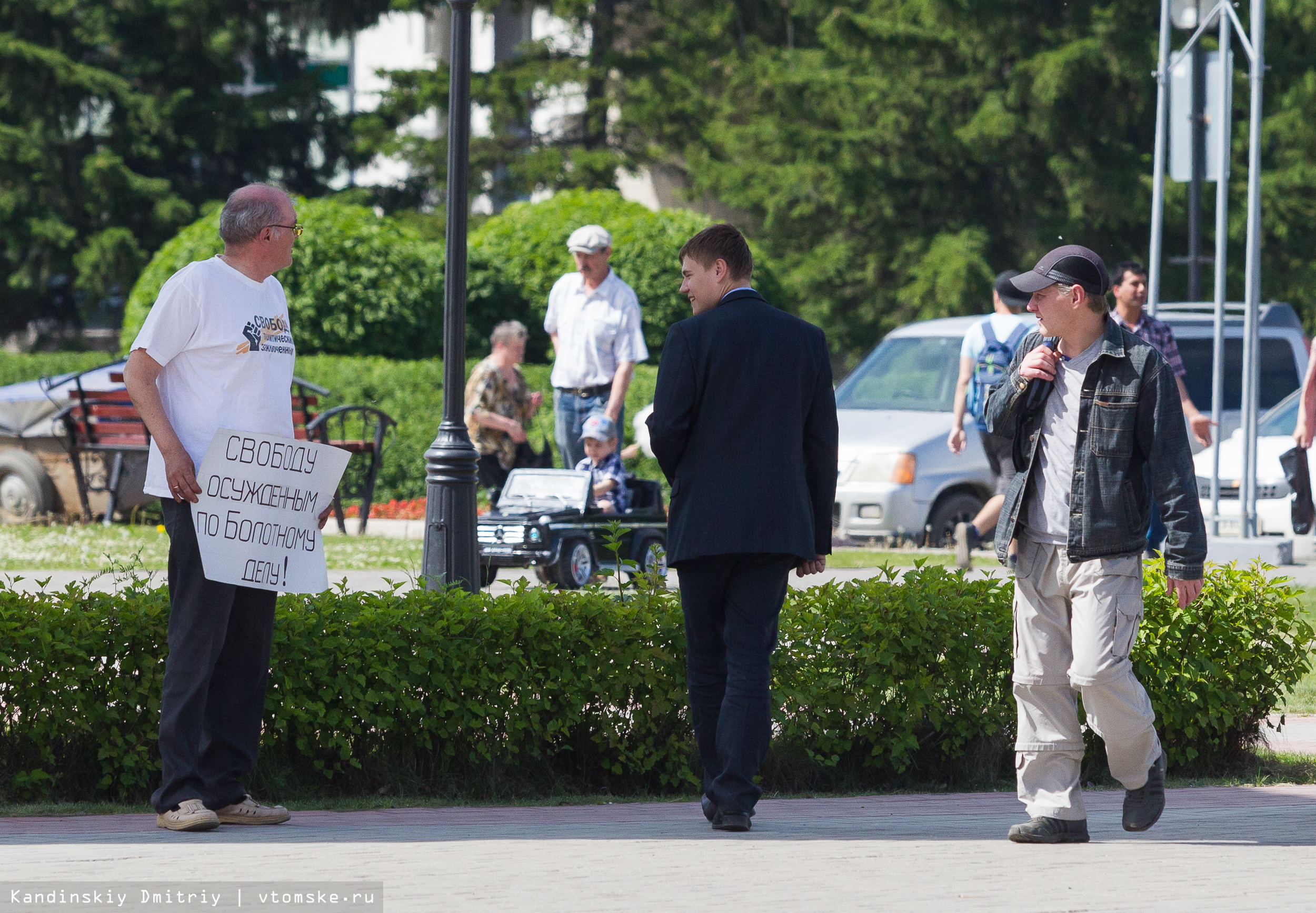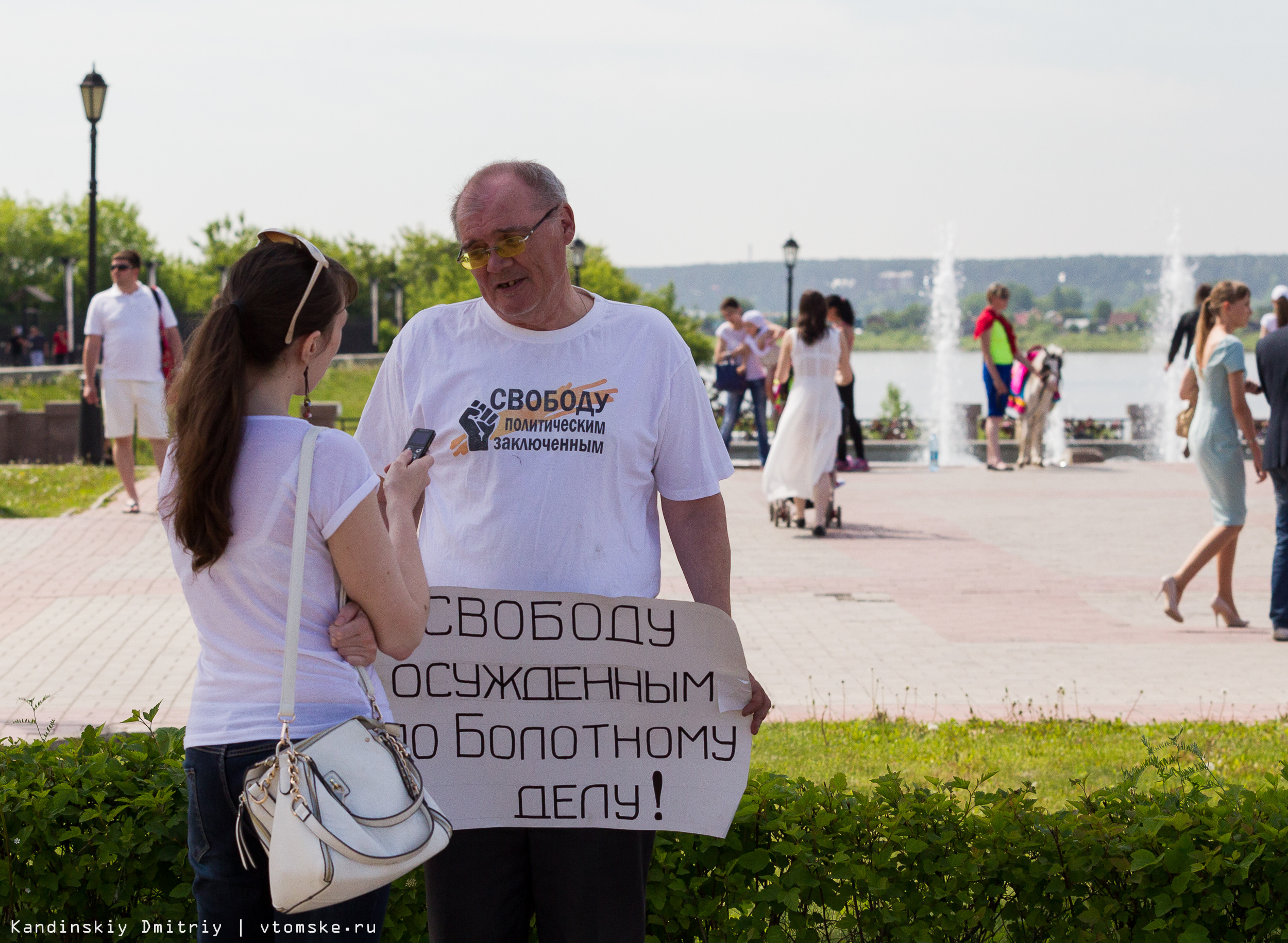 Томич Михаил Мордовин сегодня днем вышел на одиночный пикет на площадь напротив «1000 мелочей» в поддержку осужденных участников митинга, прошедшего на Болотной площади 6 мая 2012 года.