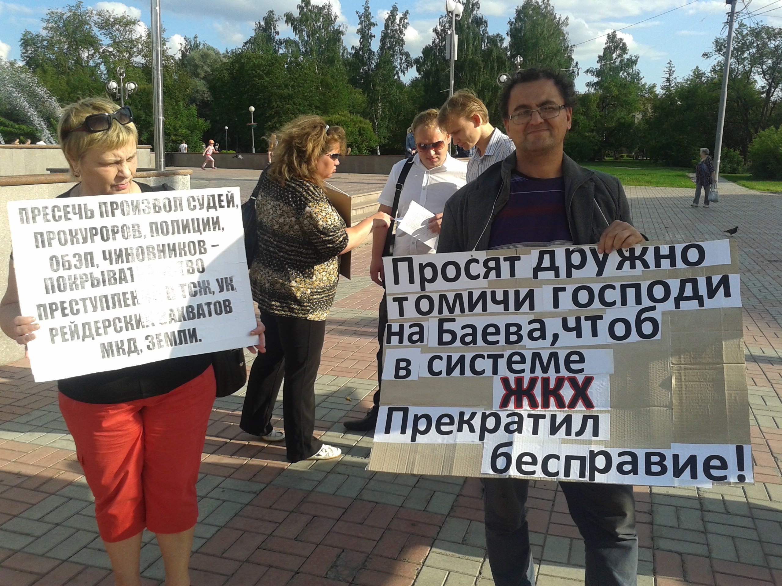 Томичи выступили против произвола прокуроров, судей, полиции, ОБЭП, чиновников, а также против бесправия в сфере ЖКХ. Один из организаторов пикета Галина Шергина убеждена, что у нее еще при мэре Александре Макарове незаконно отобрали земельный участок и продали его застройщику. При этом есть решение суда, что томичка является правообладателем. Подобные случаи, уверяет Шергина, происходили не только с ней.
