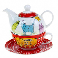 У нас есть огромный выбор чайных наборов. Есть в подарочной упаковке наборы из двух предметов — кружки и блюдца, а есть тоже в красивой упаковке веселенькие наборы из трех предметов — чайника, кружки и блюдца. И, разумеется, все они снабжены веселыми надписями. Кто, например, останется равнодушным к надписи на кружке «Люблю тебя больше, чем котиков»? Только тот, у кого нет сердца!