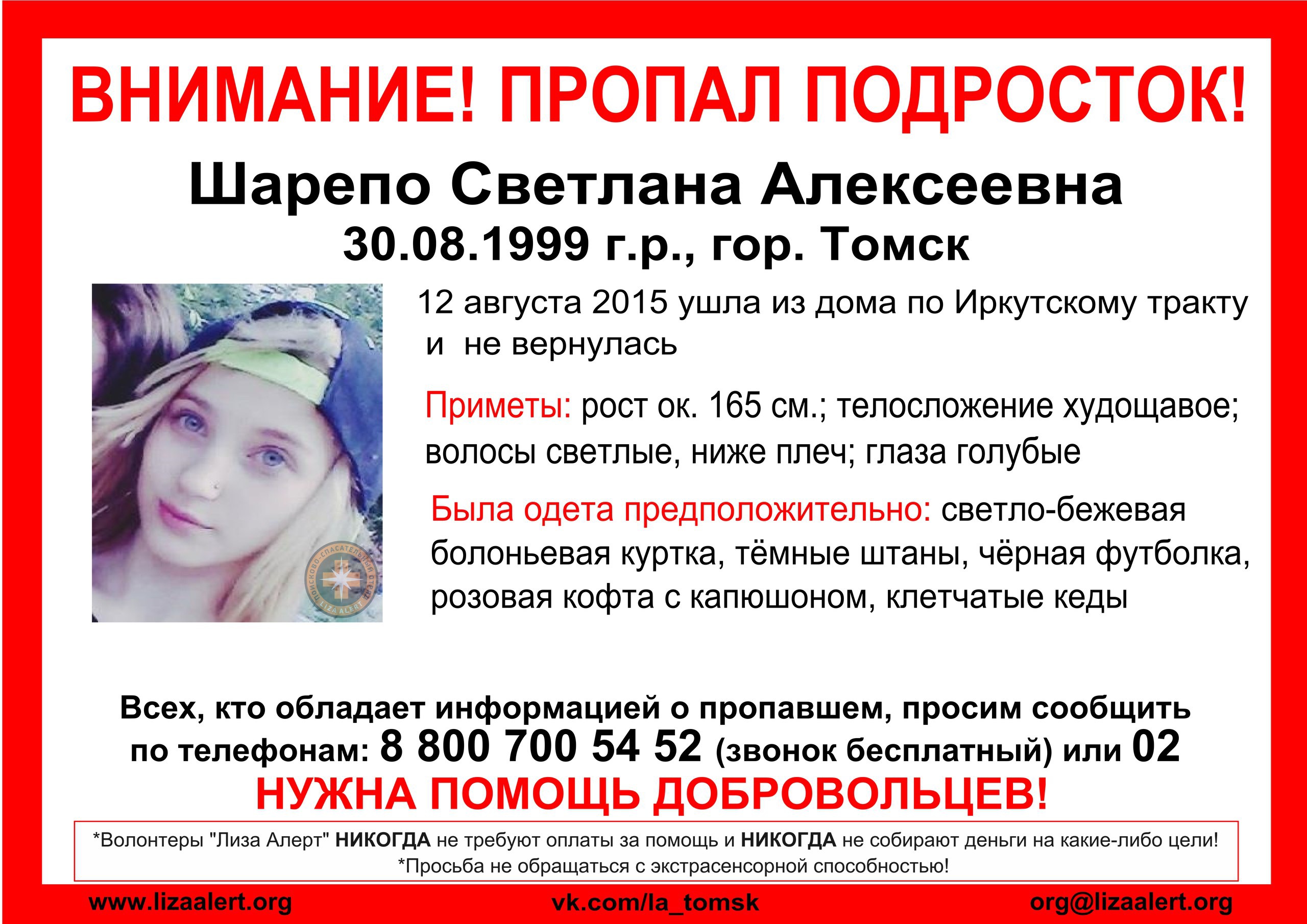 Пропавшая — Светлана Шарепо 1999 года рождения. 12 августа она ушла из дома по Иркутскому тракту и не вернулась. Позже стало известно, что она вышла на связь с родственниками и обещала вернуться домой. Однако сегодня волонтеры снова объявляют о ее поисках.