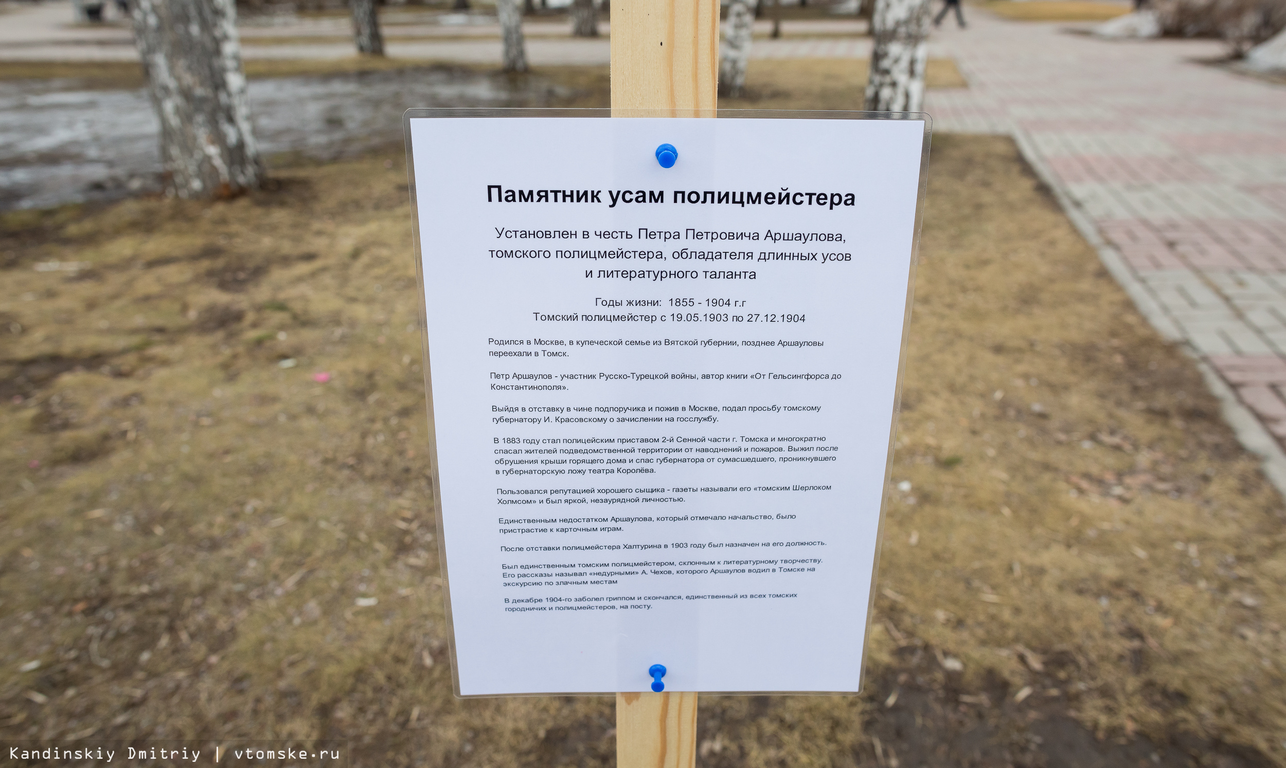 Согласно данным с таблички памятника, Петр Аршаулов, которому посвящен памятник, родился в Москве в купеческой семье. Позднее его родители переехали в Томск. Он был участником Русско-Турецкой войны, написал книгу «От Гельсингфорса до Константинополя». С мая 1903 по 1904 годы исполнял должность томского полицмейстера.