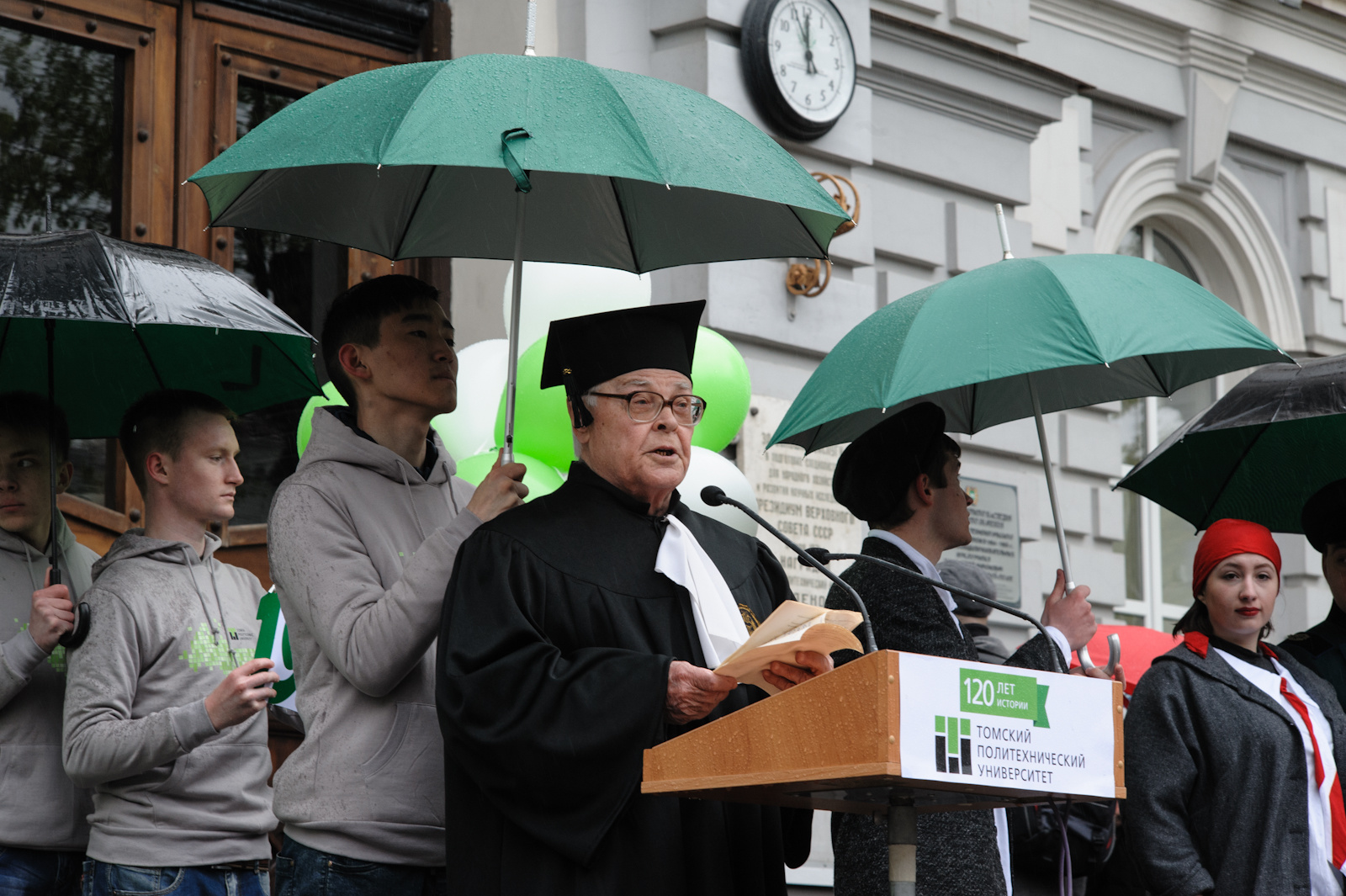 На торжественном митинге, посвященном 120-летию университета, политехников поздравили выпускники сразу шести поколений: студенты из прошлого — выпускник 1906 года Владимир Ванюков, окончившая томский политех в 1930 году Антонина Пирожкова, выпускник 1930-1940-х годов Константин Беляк и ректоры ТПУ с 1981 года по наши дни — Иван Чучалин, Юрий Похолков и Петр Чубик.