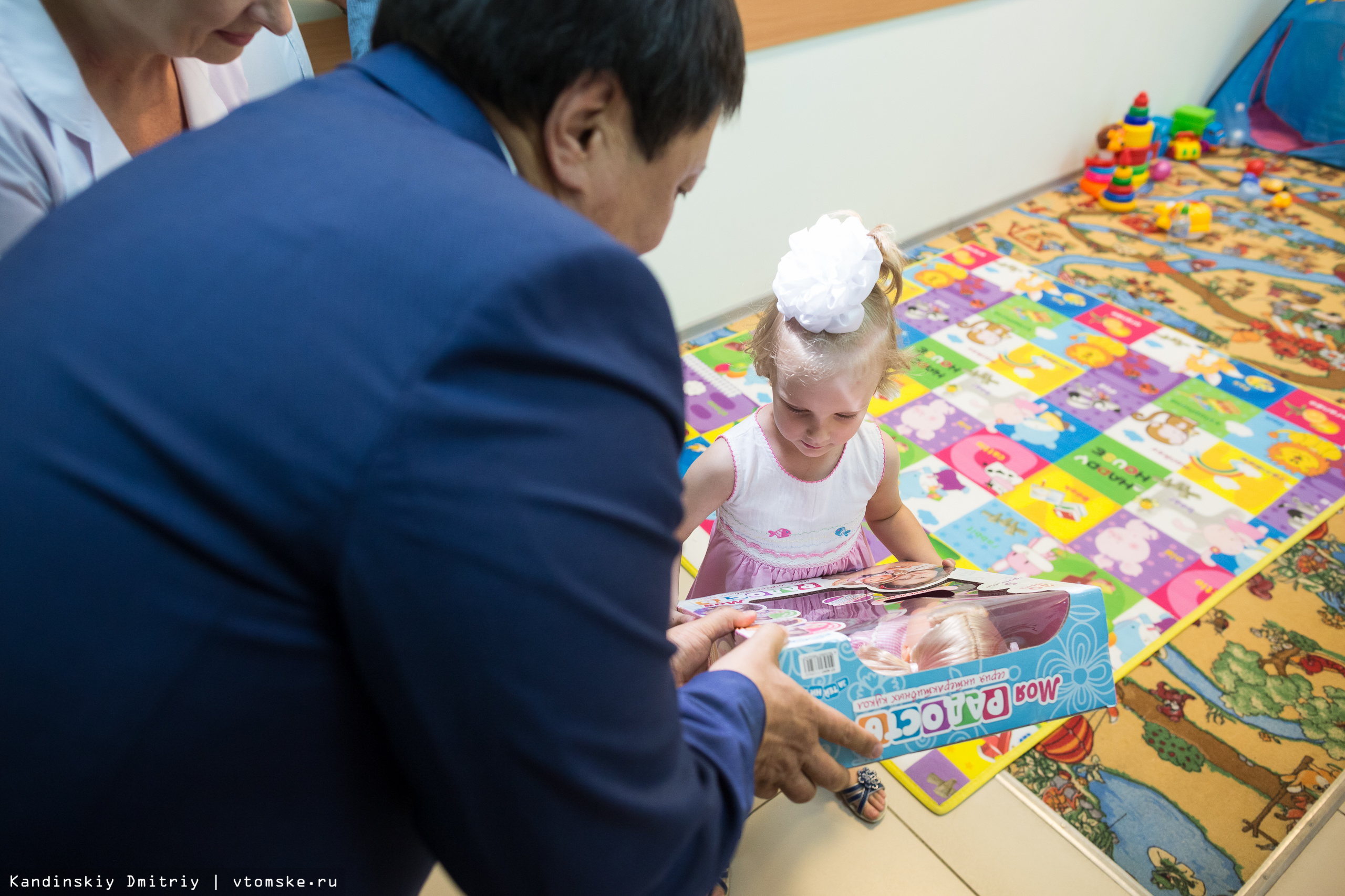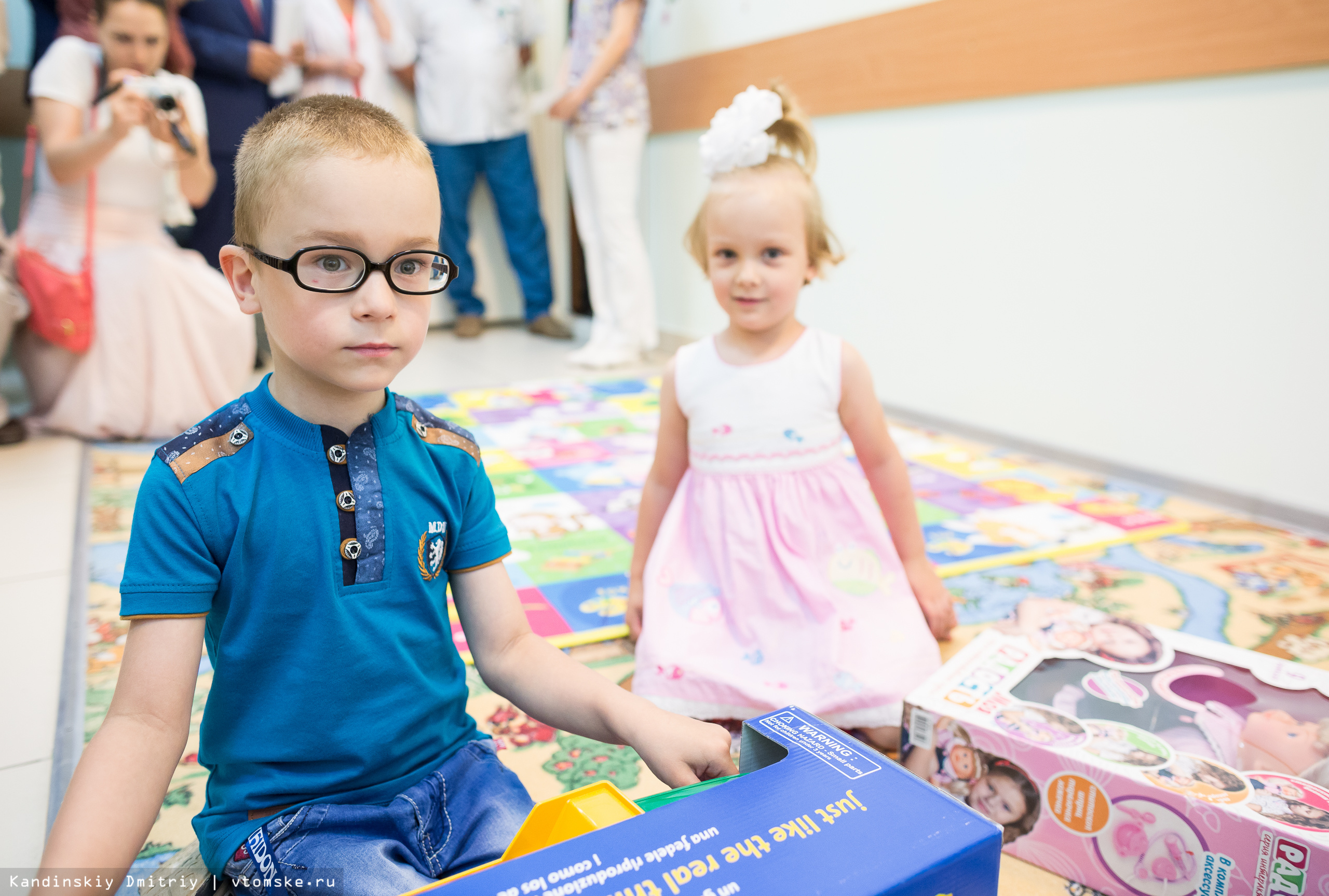 В отделении катамнеза гости подарили игрушки одним из первых пациентов центра. При рождении они имели экстремально низкую массу тела: девочка родилась весом в один килограмм, а мальчик — чуть более 900 граммов. В настоящее время детям 3,5 и 4 года, они чувствуют себя хорошо.
