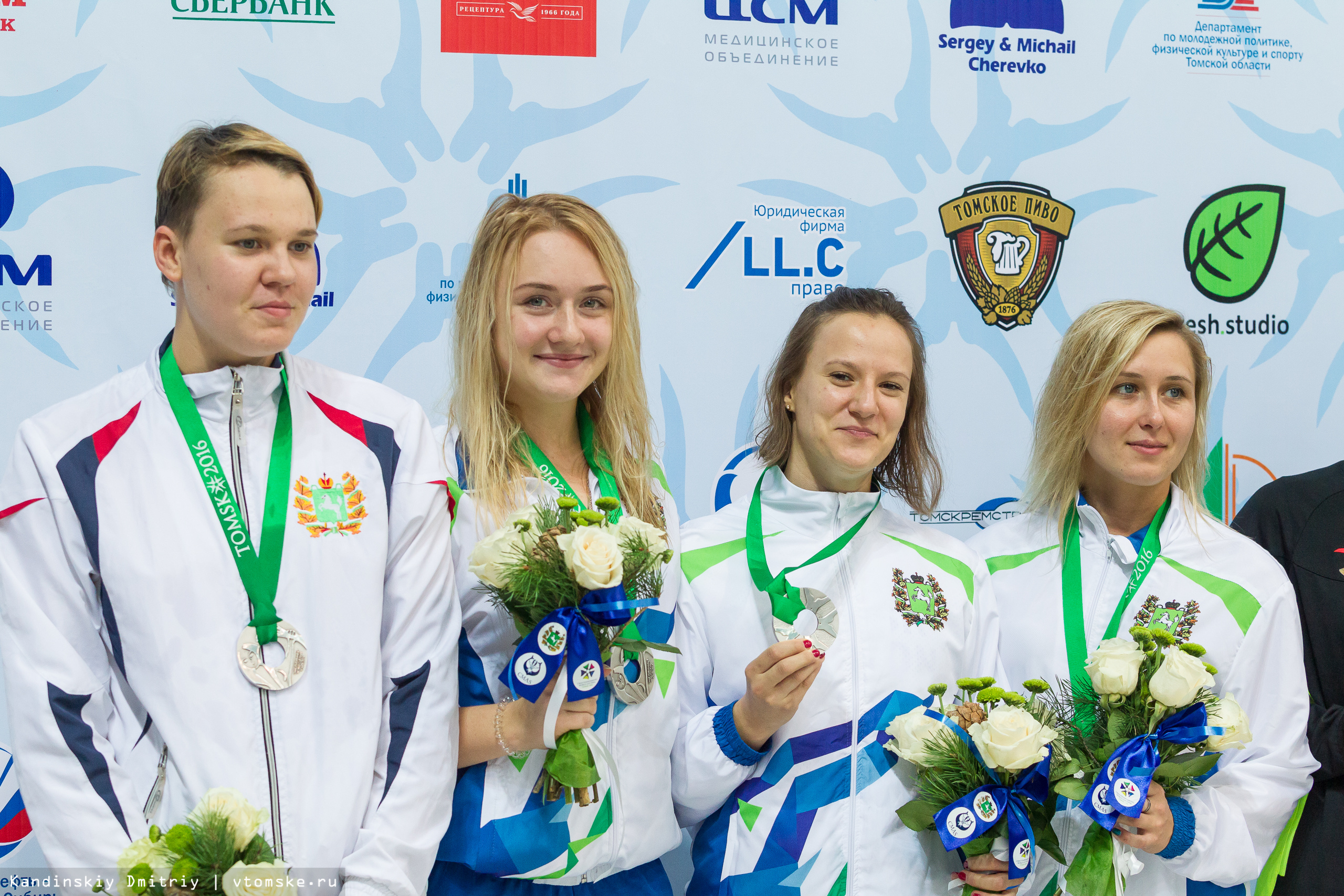 В эстафете 4х100 метров среди девушек выступили шесть команд Томской, Челябинской областей, Красноярского края, Чехии. Лучший результат (02.50,36) показала томская команда, в которой выступили Ольга Дубровина, Анастасия Андрейчук, Мария Надеина и Алена Паршина. Вторыми пришли подводники Чехии (02.53,69), третьими — спортсмены Красноярского края (02.55,42).