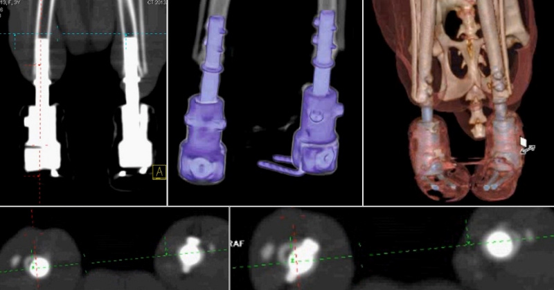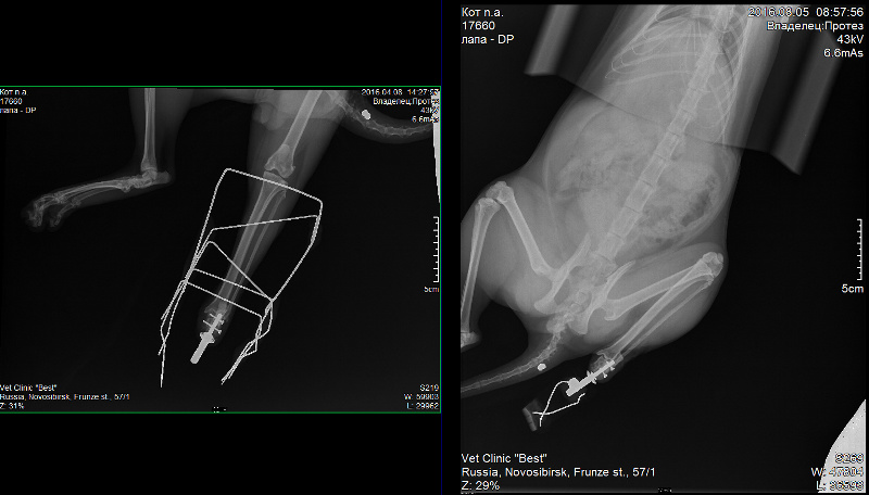 «У одного из котов отсутствовала передняя лапа, у другого — задняя. Их хозяева обратились в ветклинику, и врачи предложили им опробовать способ лечения с использованием имплантатов с нашим покрытием. Хозяева согласились, животных прооперировали. Сейчас оба они находятся под наблюдением, врачи-ветеринары систематически делают им рентген и томографию, результаты которых показывают, что имплантаты успешно прижились. Четвероногие пациенты, по словам врачей, чувствуют себя с искусственными «лапами» так же комфортно, как если бы это были их собственные», — цитирует пресс-служба Сергея Твердохлебова.