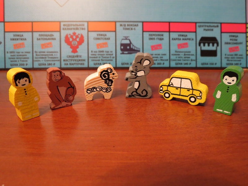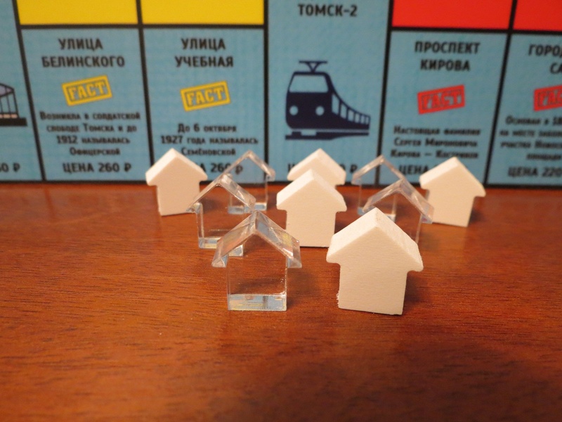 Он добавил, что игровые фишки и домики были выполнены по индивидуальному заказу. Часть домиков сделана из пластика, часть — из оргстекла. Фишки — не традиционные пластиковые кегли, а различные фигурки из дерева.