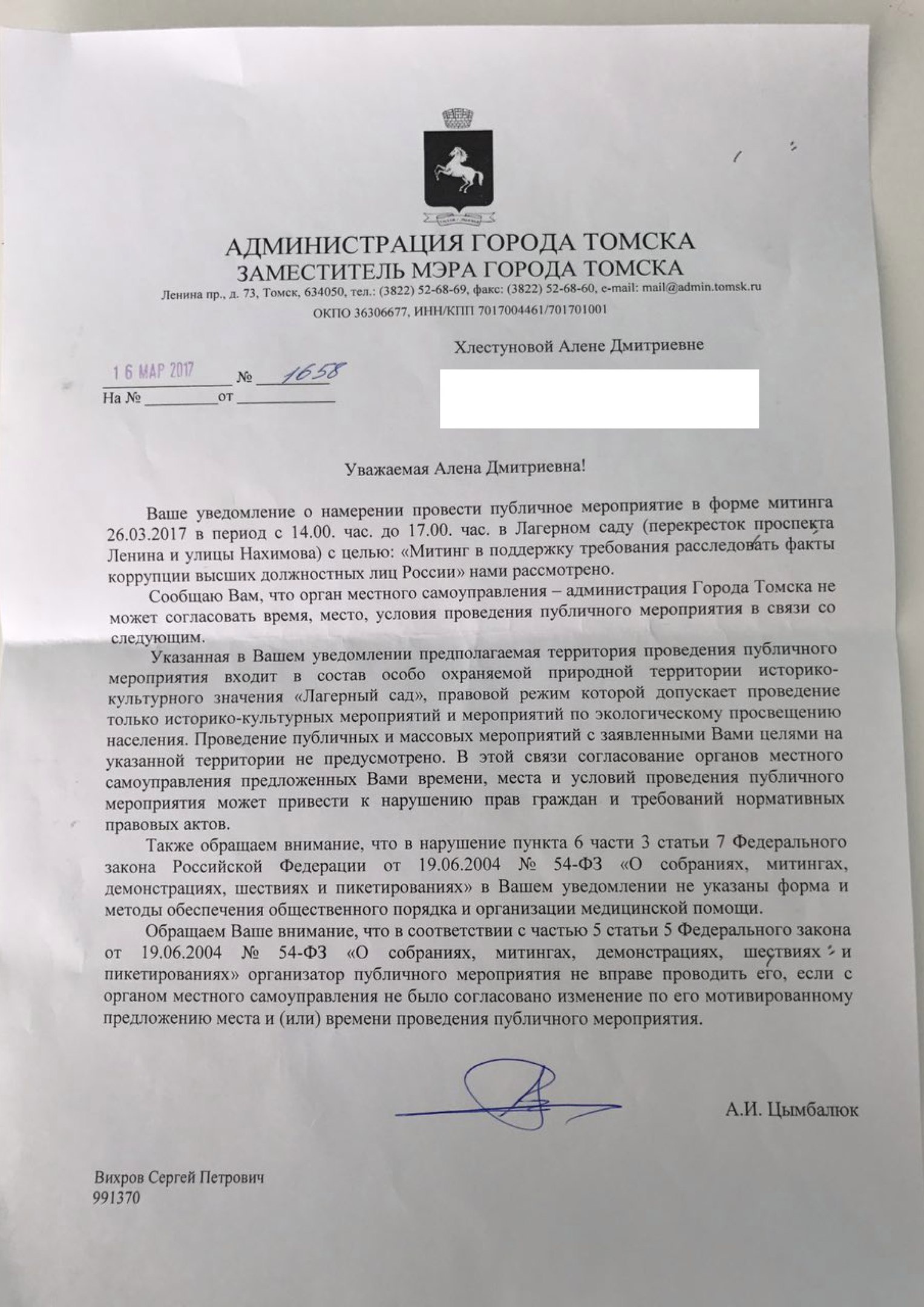 «Нам не согласовали проведение митинга 26 марта с 14 до 17 часов в Лагерном саду — там, где зимой стоял светодиодный фонтан. Отказали нам власти по той причине, что данная территория является особо охраняемой зоной, о чем Сергей Вихров из комитета общественной безопасности администрации Томска нам почему-то не сказал при подаче заявки. Теперь он говорит, что не знал об этом. При этом альтернативной площадки для проведения акции нам не предложили», — сказала Хлестунова.