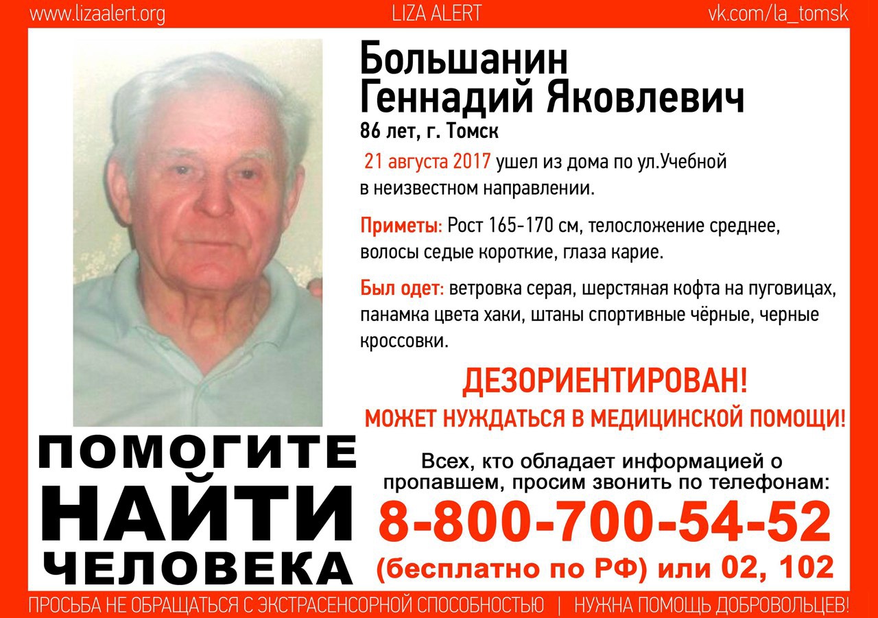 Поисково-спасательный отряд «Лиза Алерт» просит томичей помочь с поиском пропавшего в понедельник Геннадия Большанина, сообщается в группе отряда во «ВКонтакте».